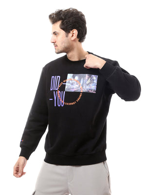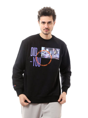 سويت شيرت رجالي عصري باللون الأسود مع طبعة مميزة على الصدر تتضمن العبارة "DID YOU" . يتميز هذا السويت شيرت بتفاصيل فنية على الأكمام وجمالية لونية تجمع بين البرتقالي والبنفسجي، ما يضيف لمسة من الشبابية والطاقة. مصنوع من قماش مريح، مثالي للأنشطة اليومية أو الإطلالات غير الرسمية.