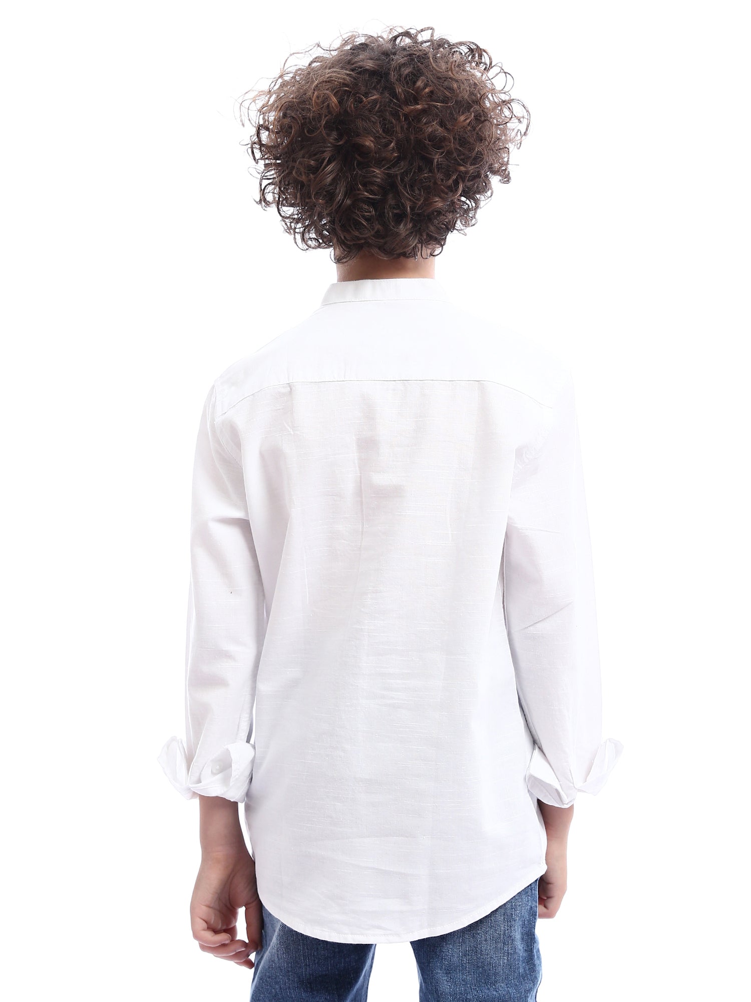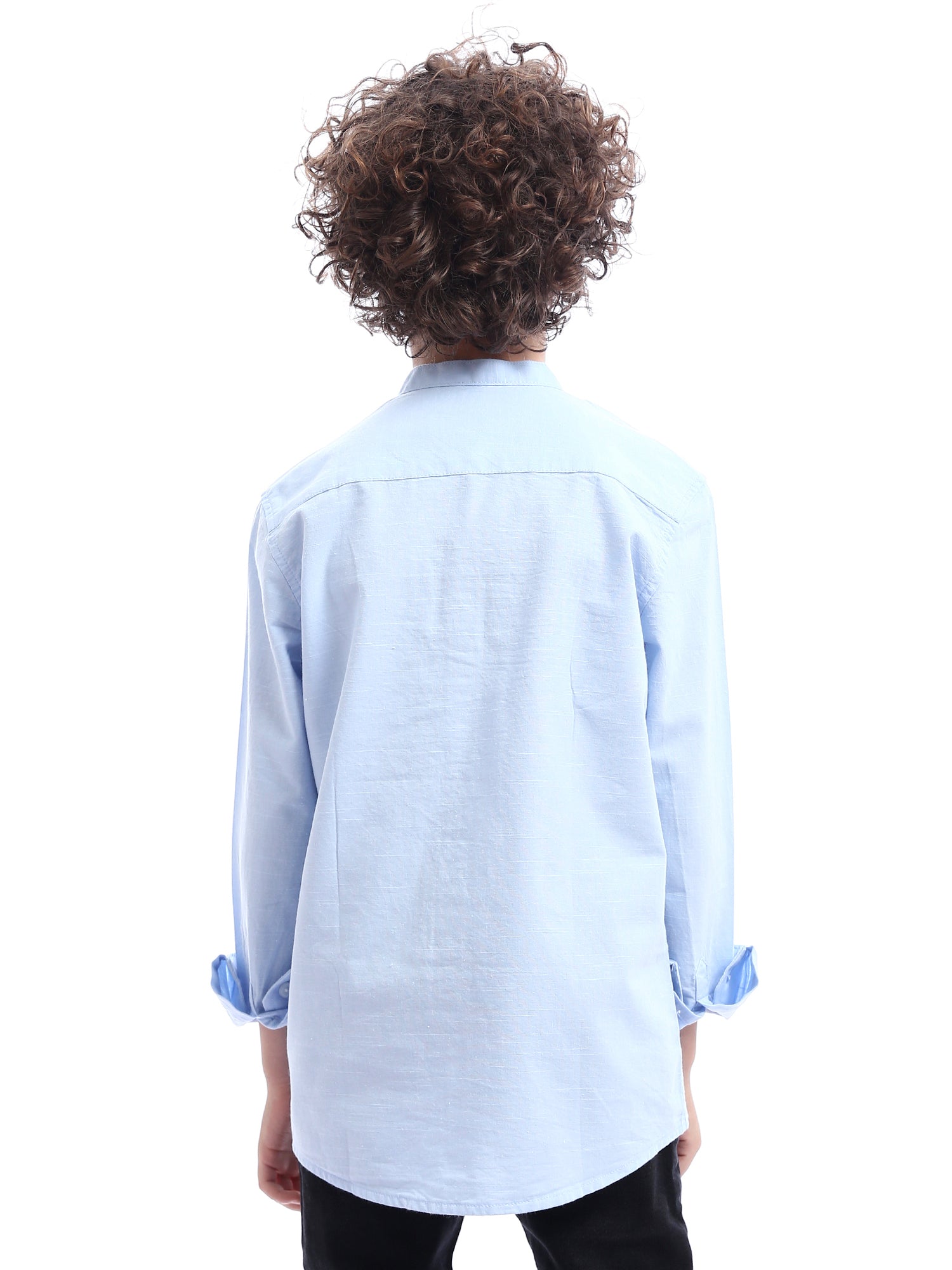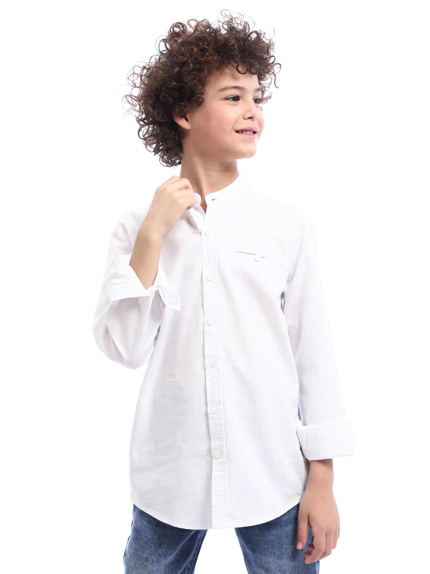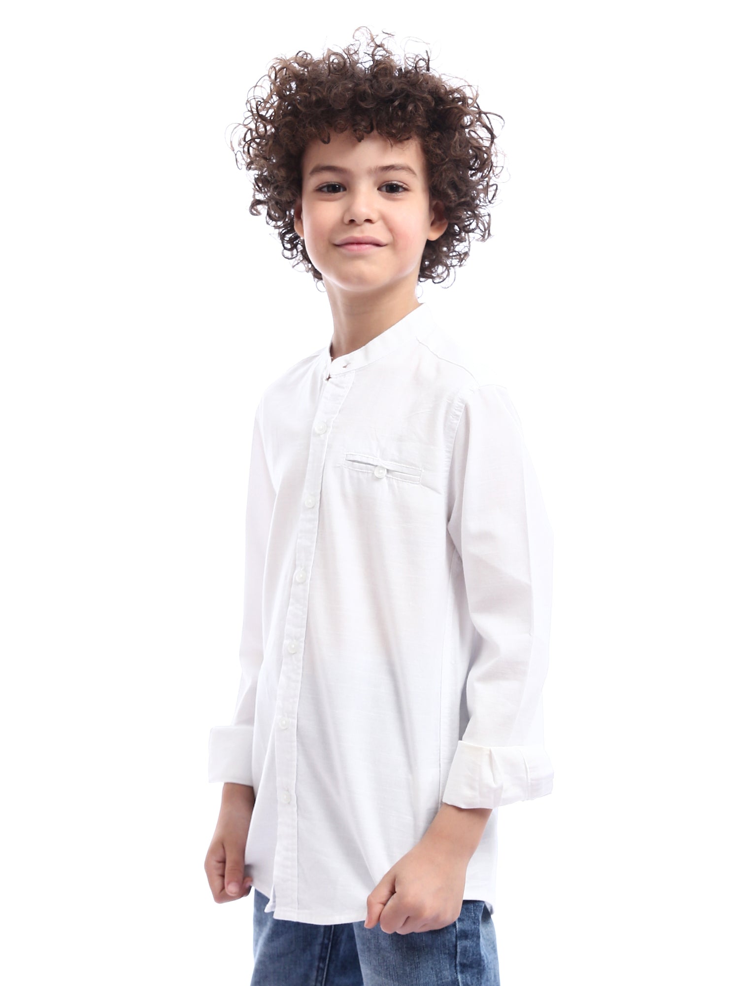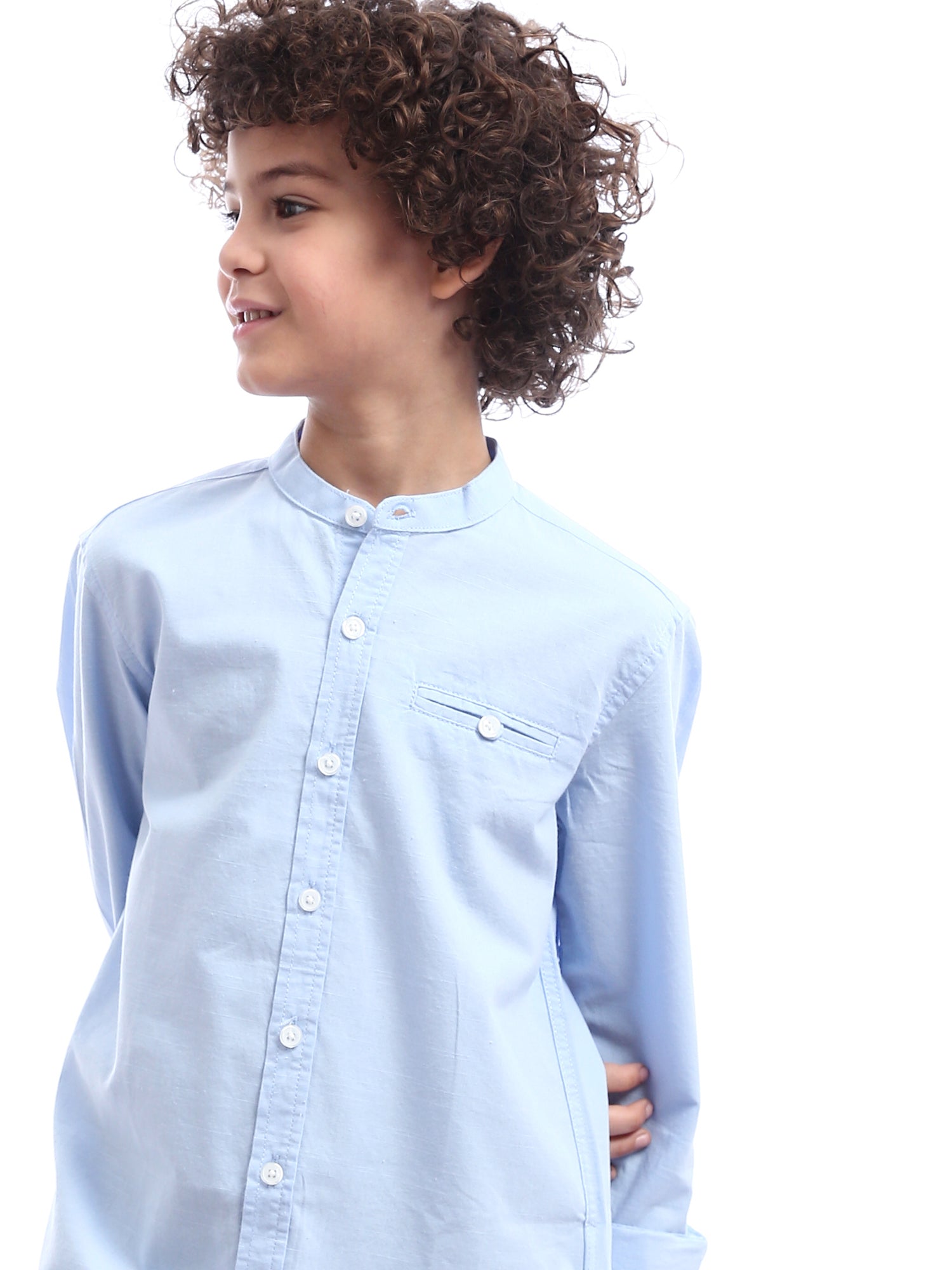 قميص أطفال مع ياقة مستقيمة وأزرار أمامية. يتميز بتصميم بسيط وأنيق، مع تفاصيل جيب صغير على الصدر لإضفاء لمسة مميزة. مناسب للإطلالات اليومية أو المناسبات غير الرسمية، مما يجعله الخيار المثالي للأطفال الباحثين عن الراحة والأناقة.