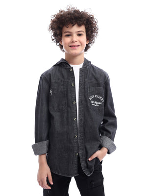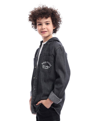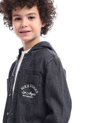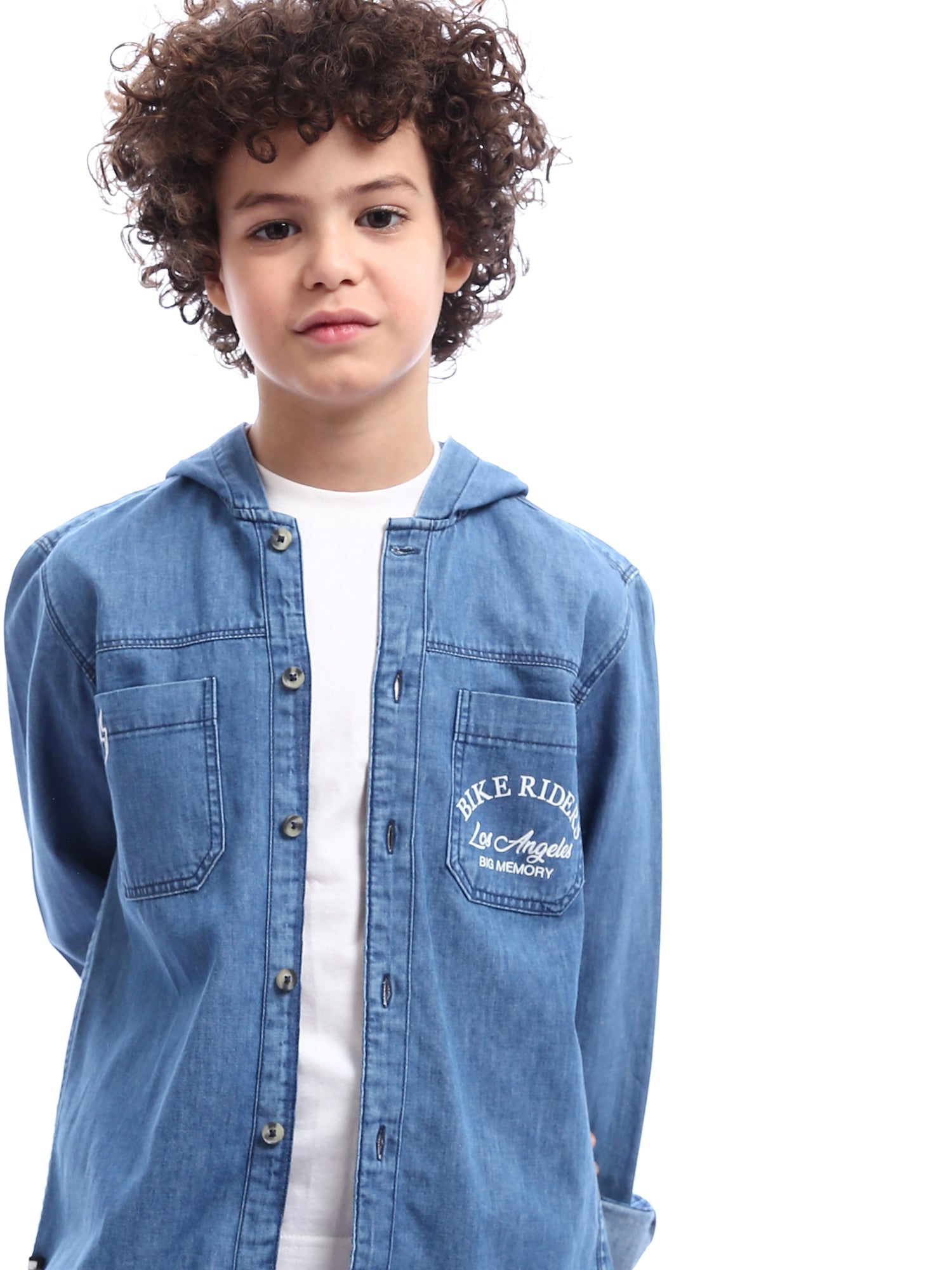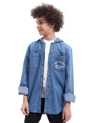 قميص جينز أولادي بغطاء رأس ، مزود بأزرار أمامية وجيوب على الصدر لزيادة العملية. يحمل طبعة "بايك رايدرز" على الجهة الأمامية مع تفاصيل مميزة تضفي لمسة شبابية على التصميم. يمكن ارتداء القميص كسترة خفيفة في الأيام الباردة أو كخيار عصري للأنشطة اليومية.