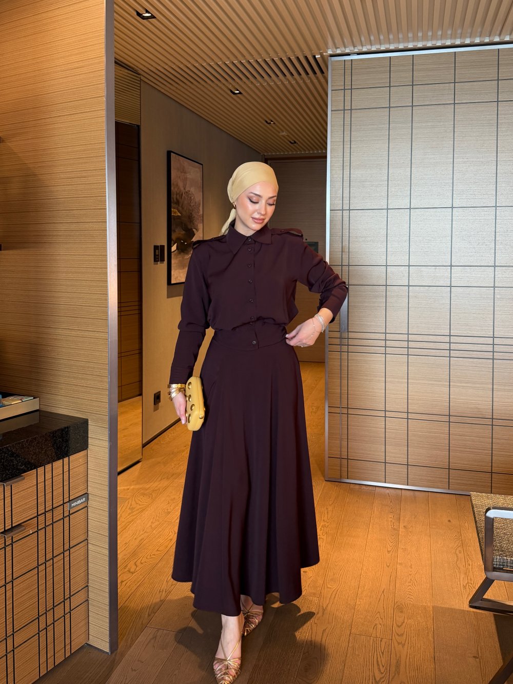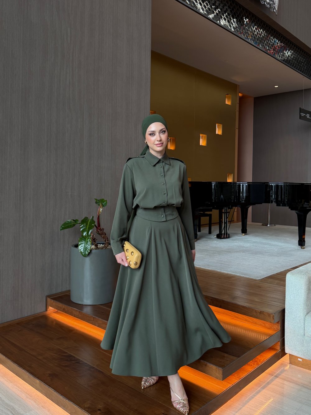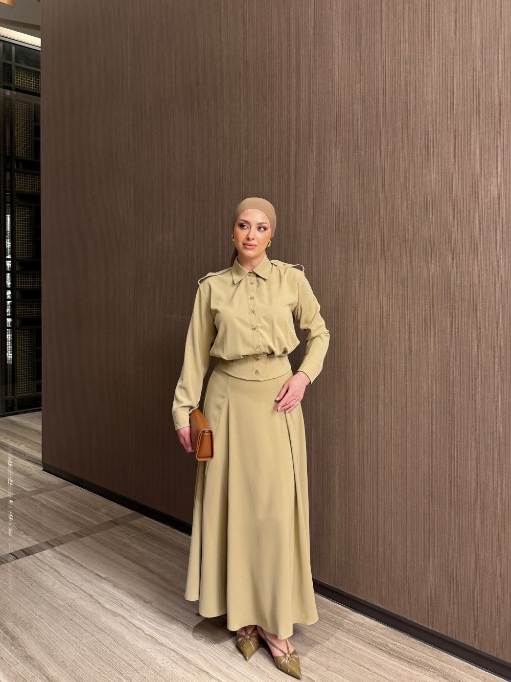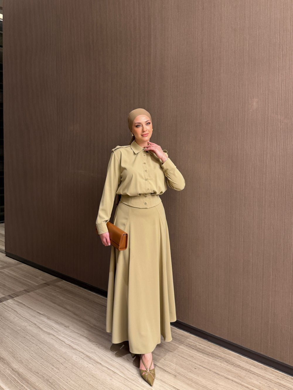 أما التنورة الطويلة فتتميز بقصة انسيابية أنيقة تبرز جمال الإطلالة، مع سحاب جانبي عملي يضمن سهولة اللبس وثباتاً مثالياً.