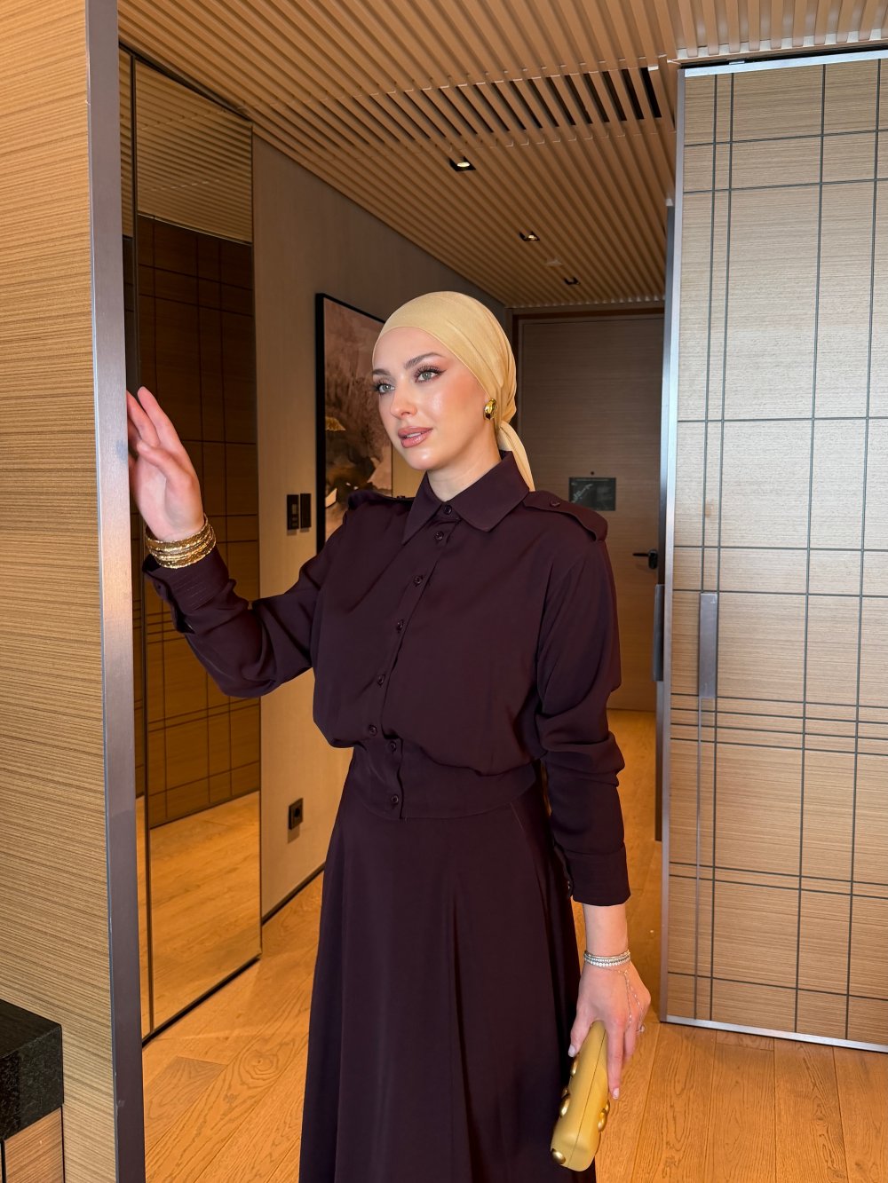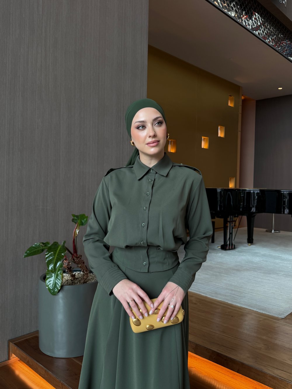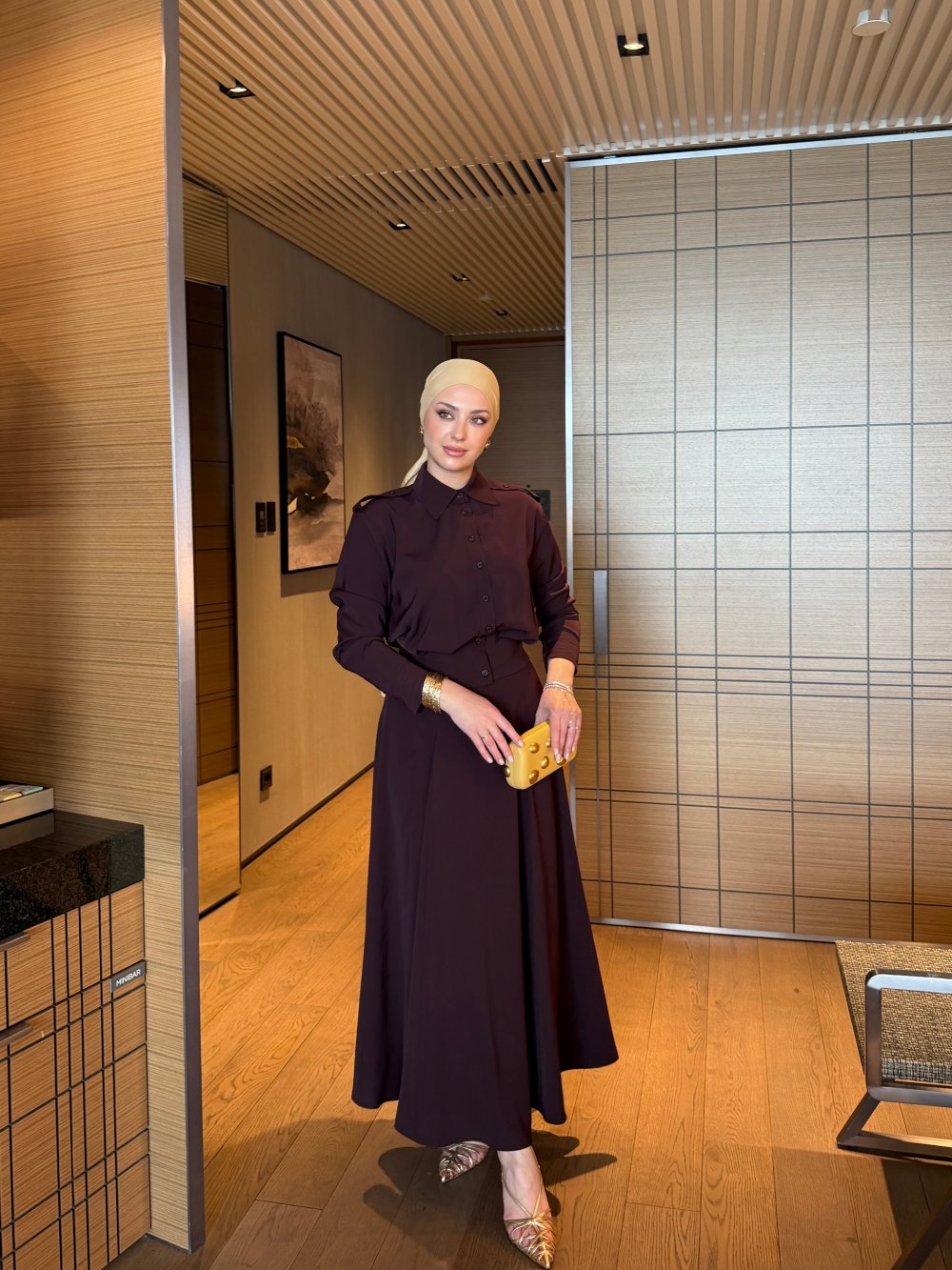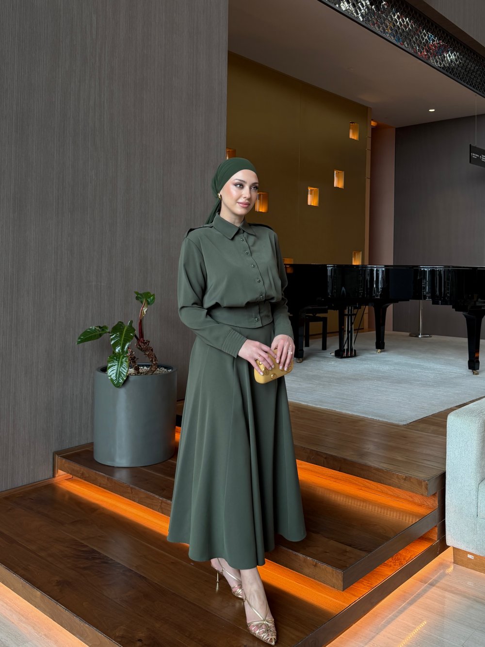 أما التنورة الطويلة فتتميز بقصة انسيابية أنيقة تبرز جمال الإطلالة، مع سحاب جانبي عملي يضمن سهولة اللبس وثباتاً مثالياً.
