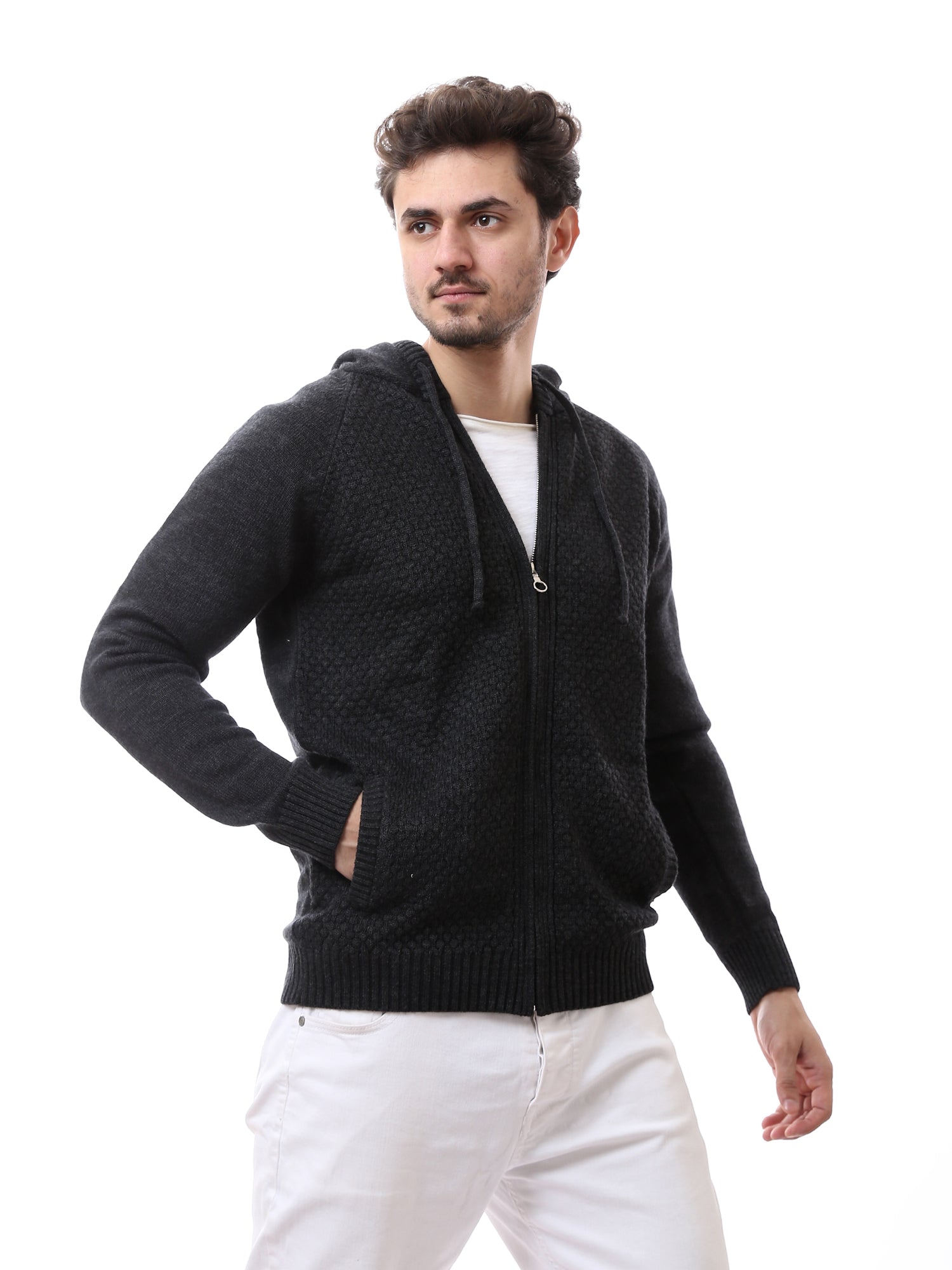 Pull homme à fermeture zippée frontale avec capuche, confectionné dans une maille de qualité offrant un style moderne et une chaleur idéale pour la saison hivernale. Il se distingue par un motif de tricot élégant sur la partie avant, ainsi que par des manches et des finitions côtelées assurant un maintien optimal et un confort accru. Son design pratique allie confort et élégance, et se marie facilement avec un jean ou un pantalon casual pour une tenue quotidienne à la fois chic et décontractée.