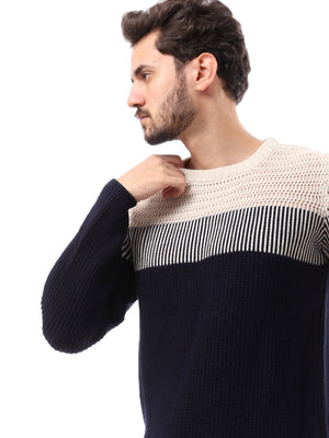 Sweat-shirt pour homme élégant au design moderne, combinant harmonieusement des couleurs sombres et claires. Il présente des détails tricotés avec des lignes horizontales qui ajoutent une touche unique au design. Les manches longues et le col rond assurent un confort total tout au long de la journée, tandis que le tissu flexible et les bords ajustés aux poignets offrent un look soigné et élégant. Il se marie facilement avec un jean ou un pantalon en tissu pour un look à la fois confortable et moderne.