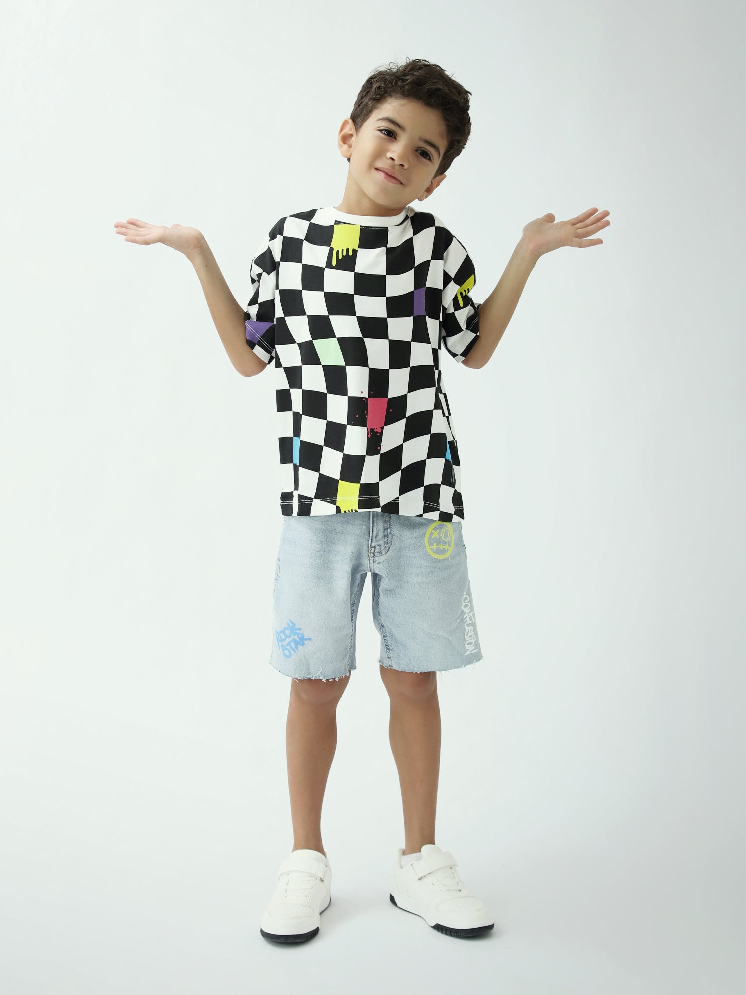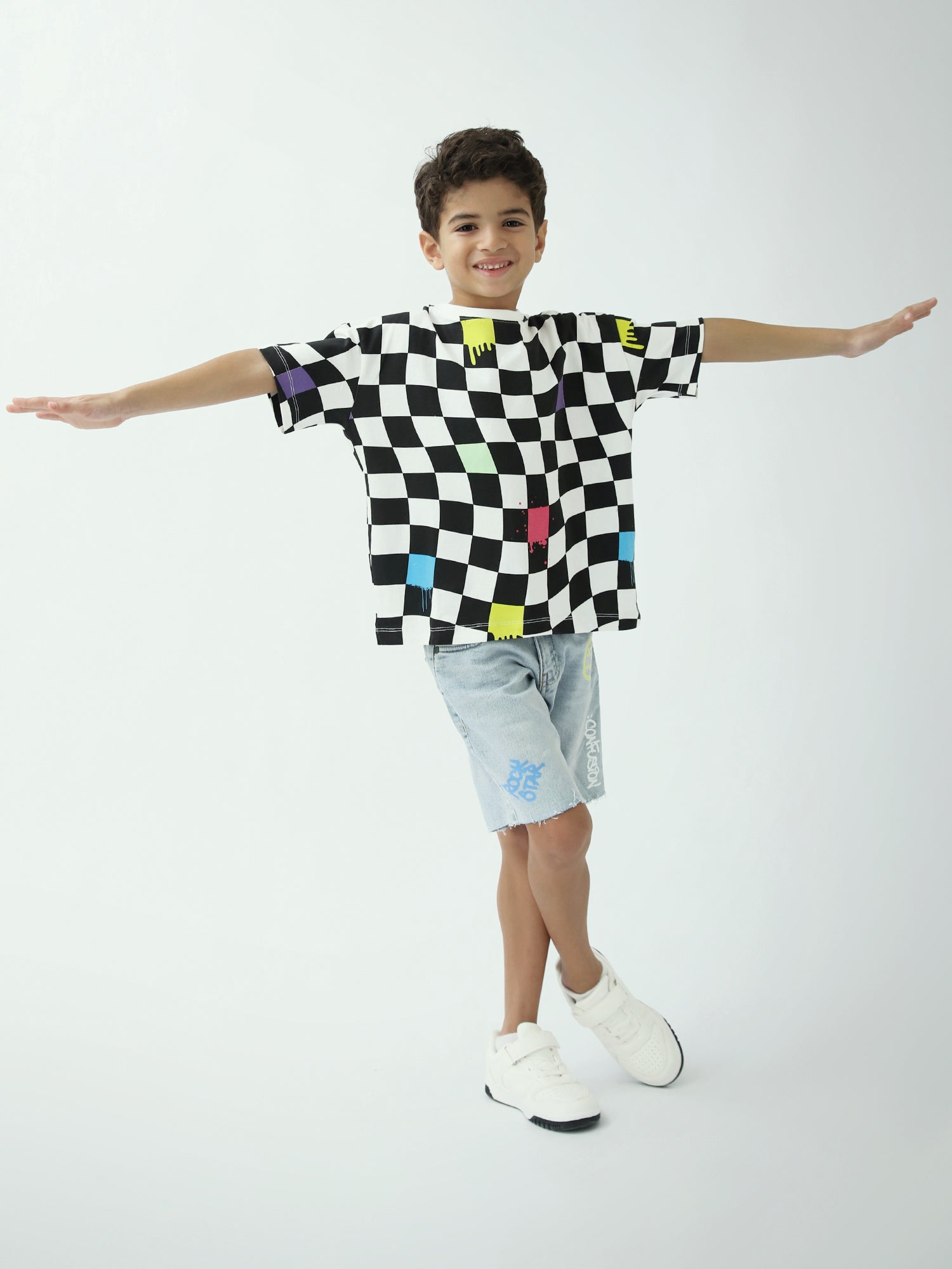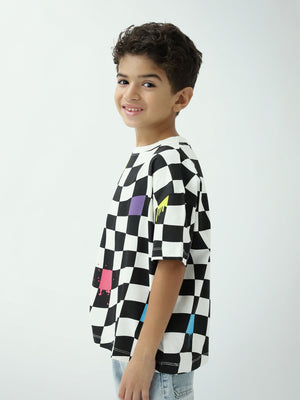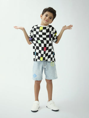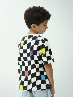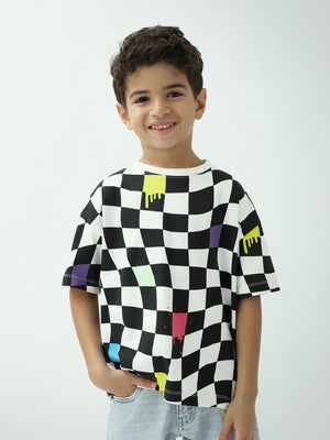 Un t-shirt tendance pour garçon avec un imprimé damier noir et blanc rehaussé de touches colorées, parfait pour un look streetwear. Léger et agréable à porter au quotidien, il s’associe facilement avec un jean, un short ou un pantalon cargo.