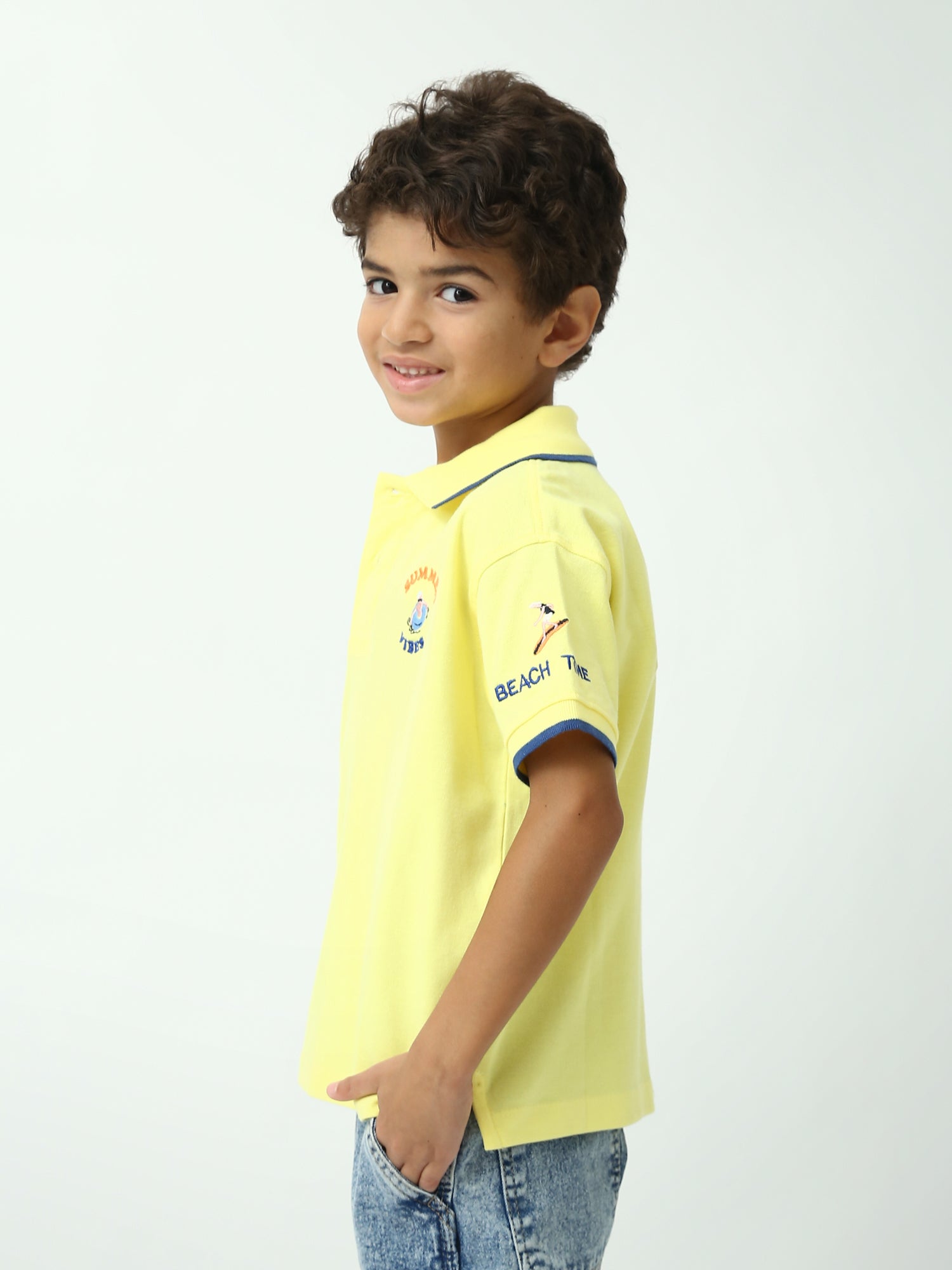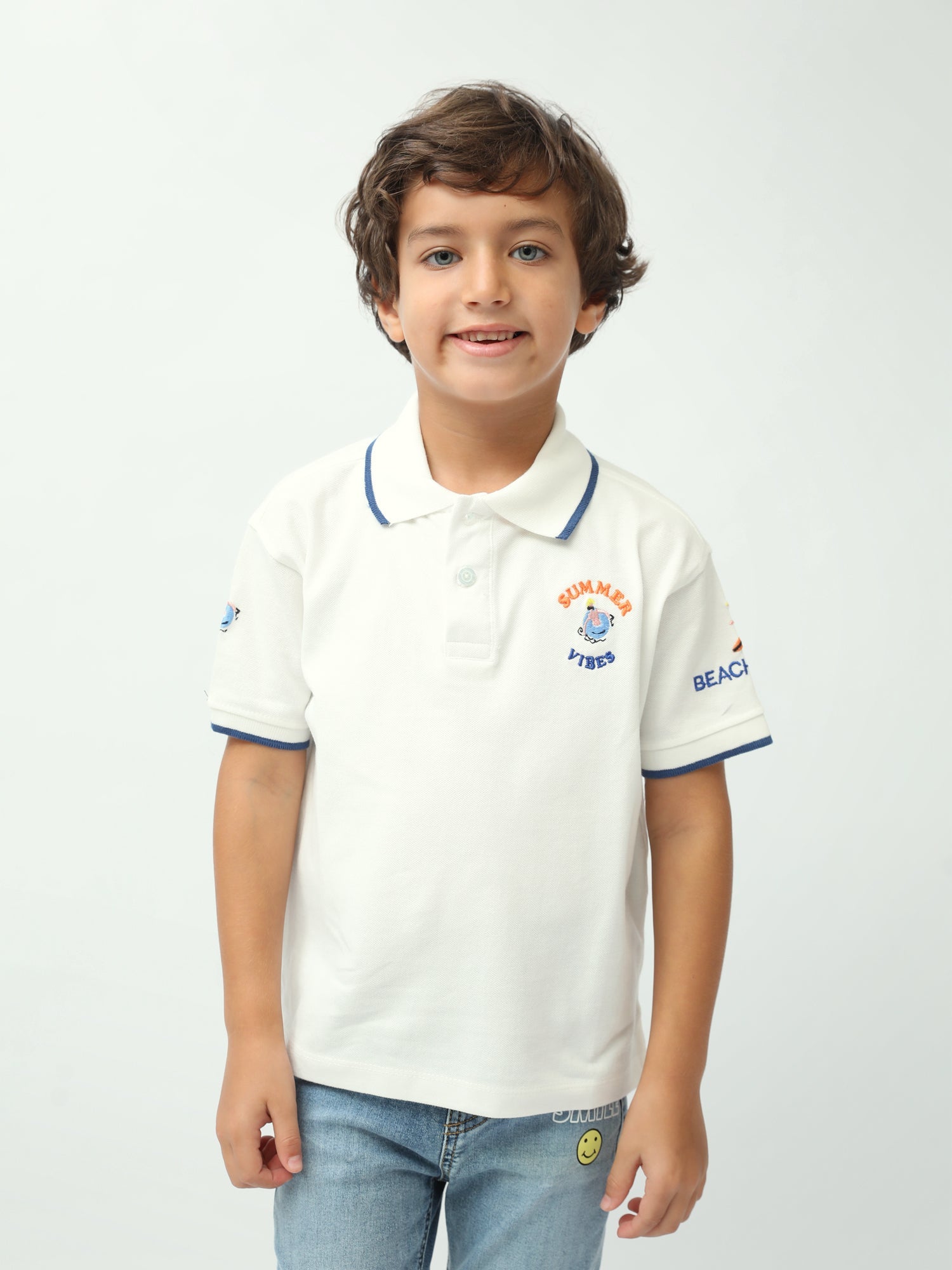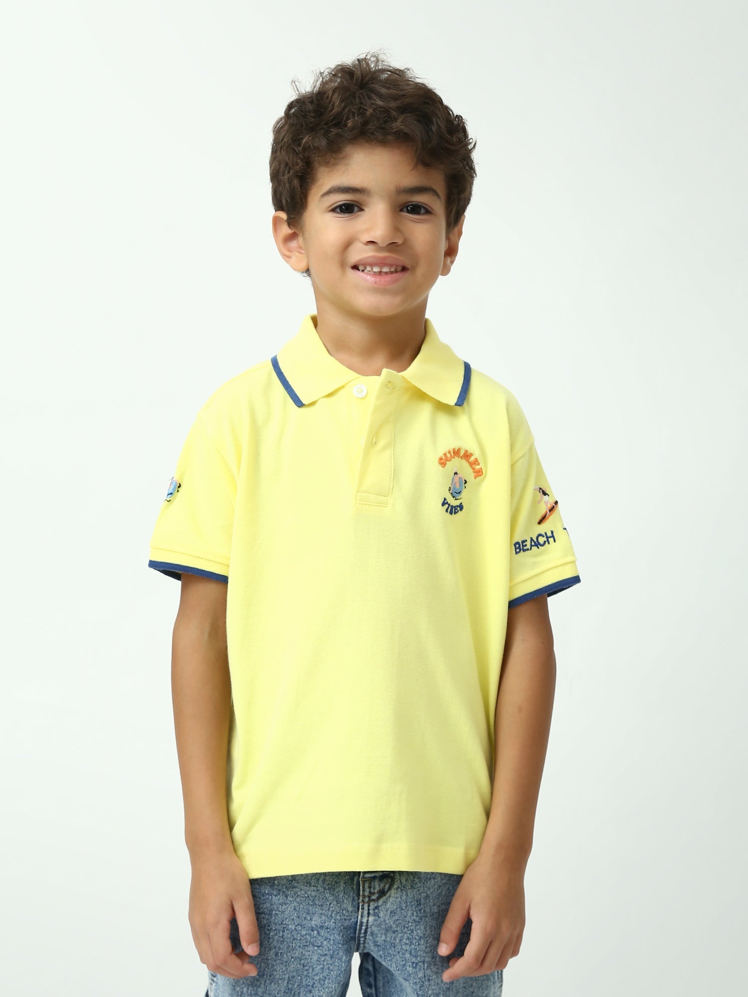 Un polo garçon simple, élégant et parfait pour l’été ! Ce modèle “Summer Vibes” combine un col polo classique avec des finitions contrastées qui donnent un look soigné. Le petit motif brodé sur la poitrine apporte une touche estivale discrète, idéale pour l’école, les sorties en famille et les vacances. Disponible en blanc ou jaune, il s’associe facilement avec un jean, un short ou un pantalon pour une tenue propre et confortable au quotidien.