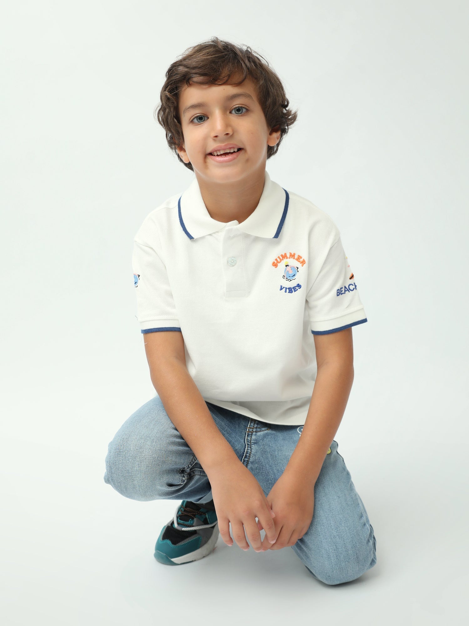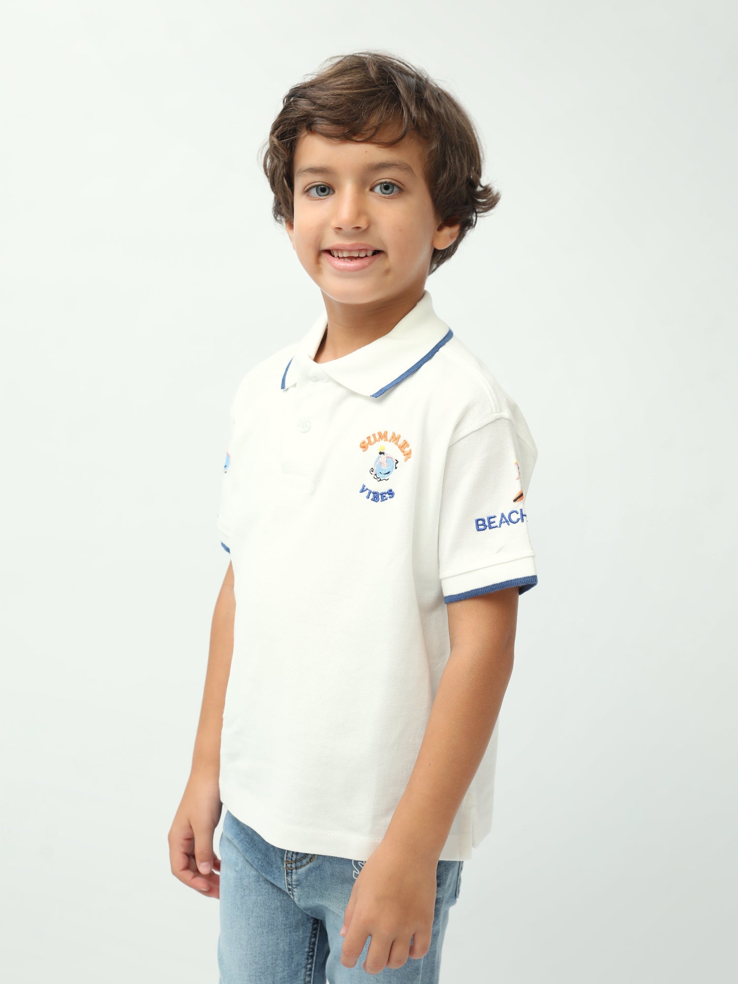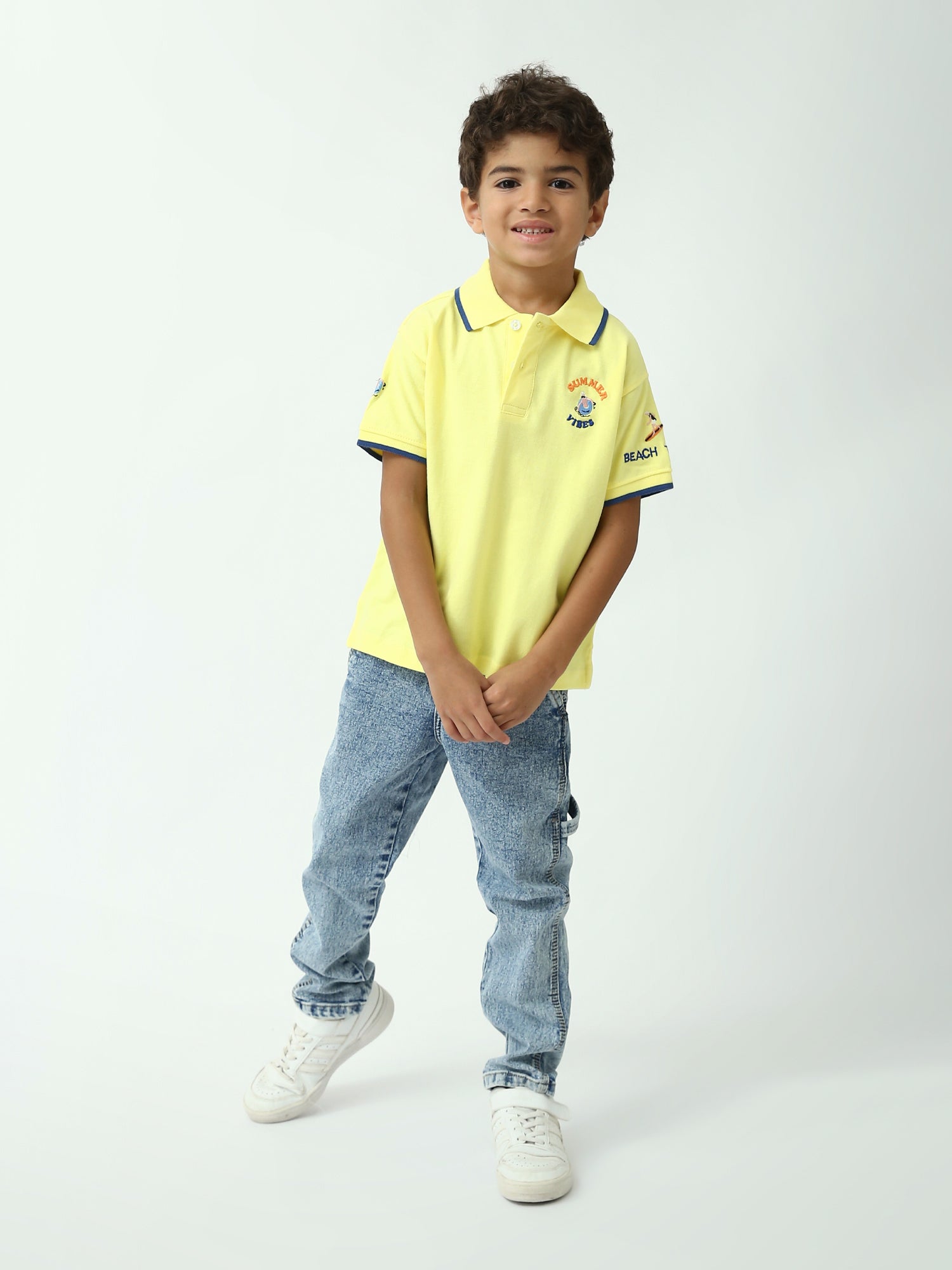 Un polo garçon simple, élégant et parfait pour l’été ! Ce modèle “Summer Vibes” combine un col polo classique avec des finitions contrastées qui donnent un look soigné. Le petit motif brodé sur la poitrine apporte une touche estivale discrète, idéale pour l’école, les sorties en famille et les vacances. Disponible en blanc ou jaune, il s’associe facilement avec un jean, un short ou un pantalon pour une tenue propre et confortable au quotidien.