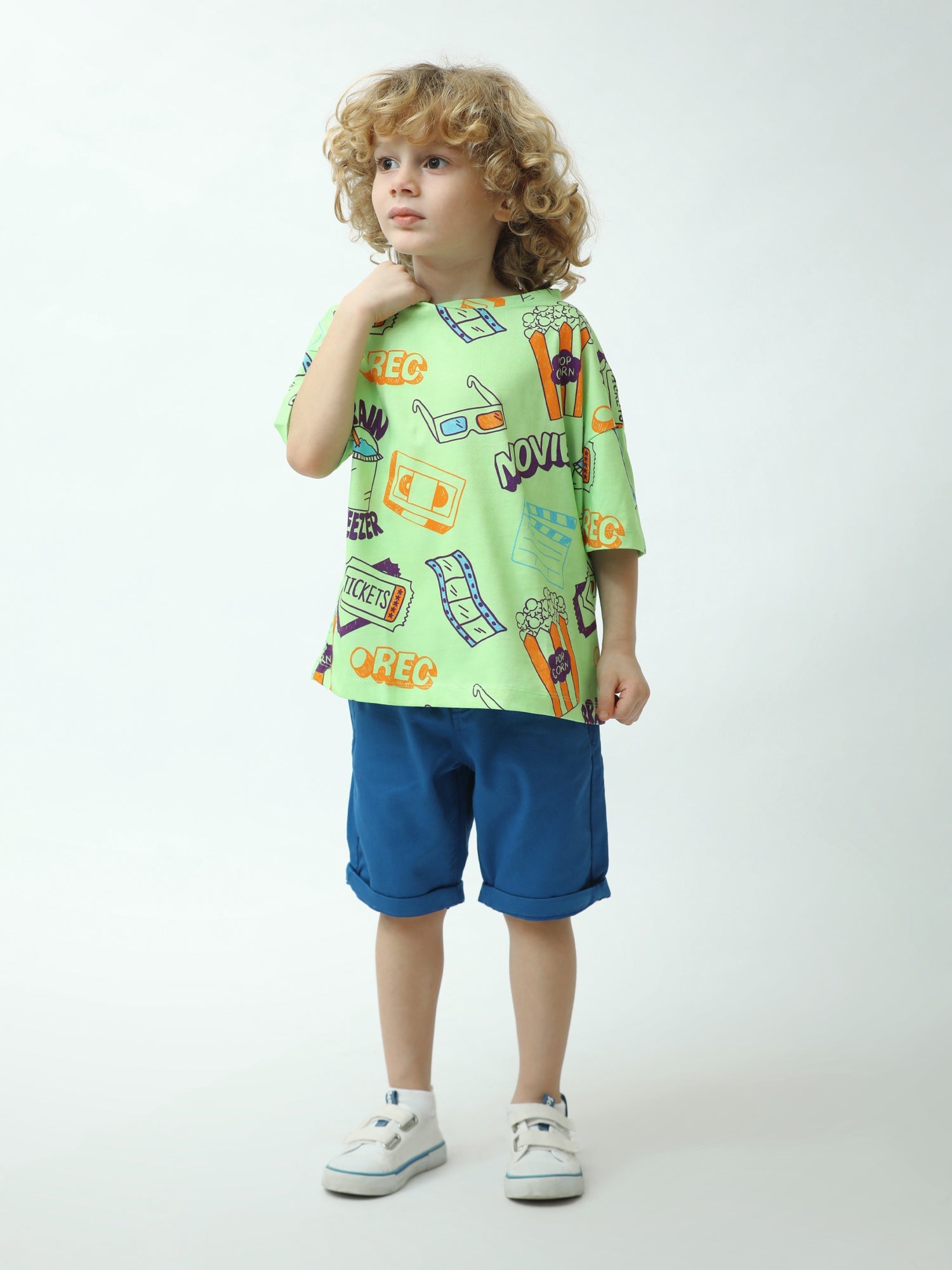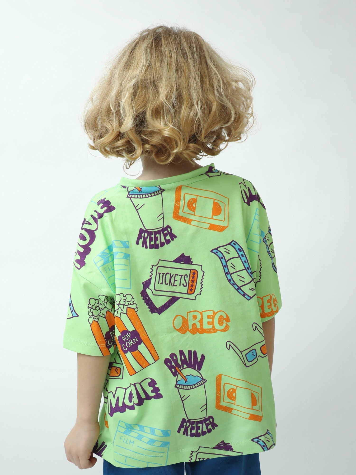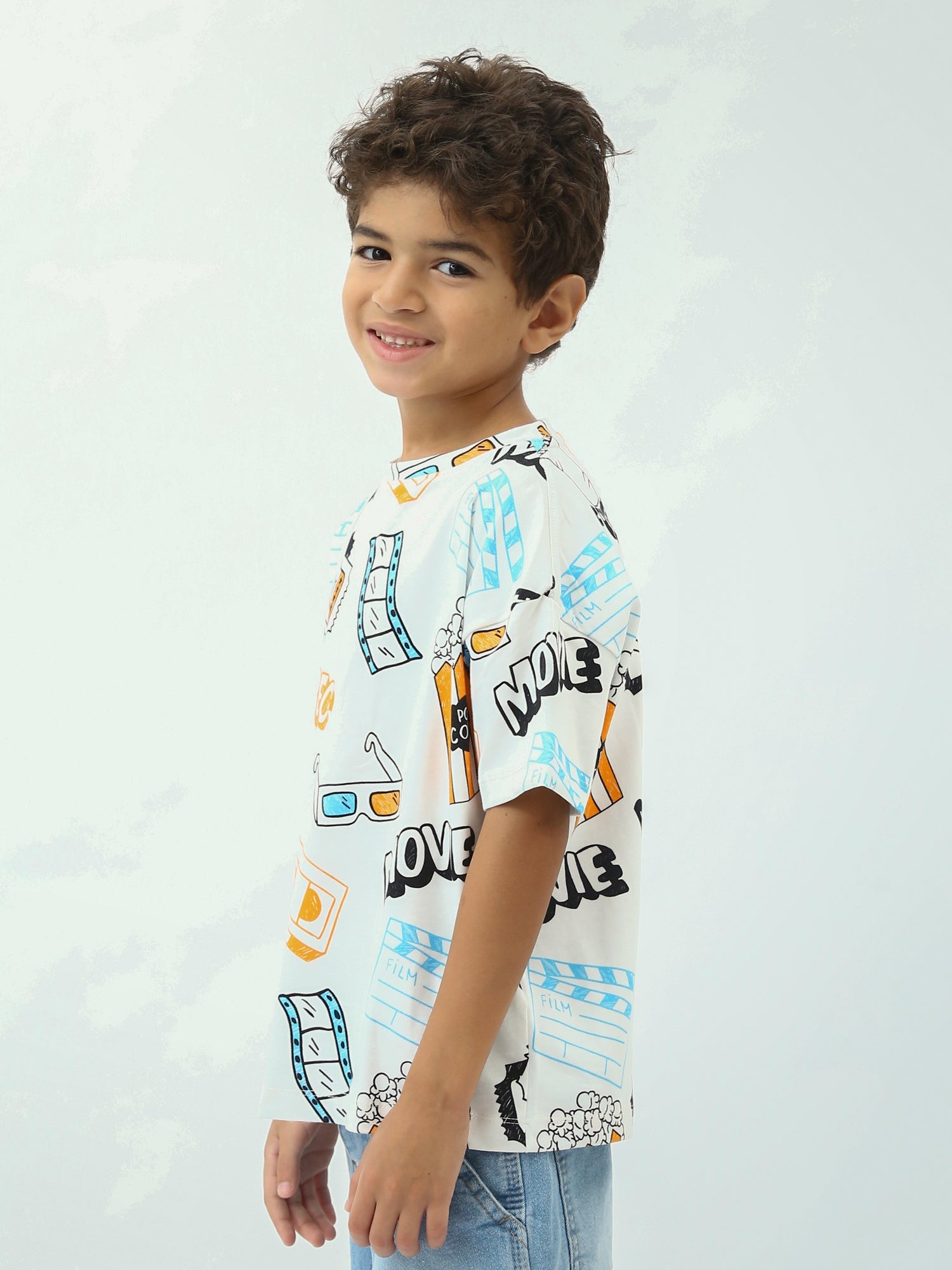 T-shirt garçon fun et tendance, parfait pour les fans de films. Son imprimé all-over inspiré de l’univers du cinéma (popcorn, tickets, lunettes 3D, pellicule, clap…) apporte une touche originale au look des enfants. Coupe confortable et agréable à porter au quotidien, idéale pour l’école, les sorties et les vacances.