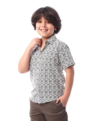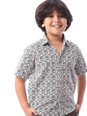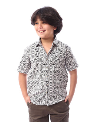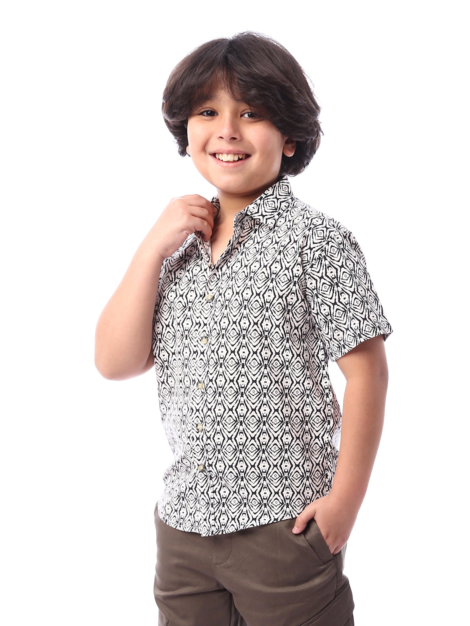 Chemise pour garçon moderne avec boutons et imprimé géométrique distinctif en noir et blanc. Un design élégant parfait pour l'été et les occasions décontractées. Elle se distingue par sa composition en coton confortable, offrant un confort tout au long de la journée.