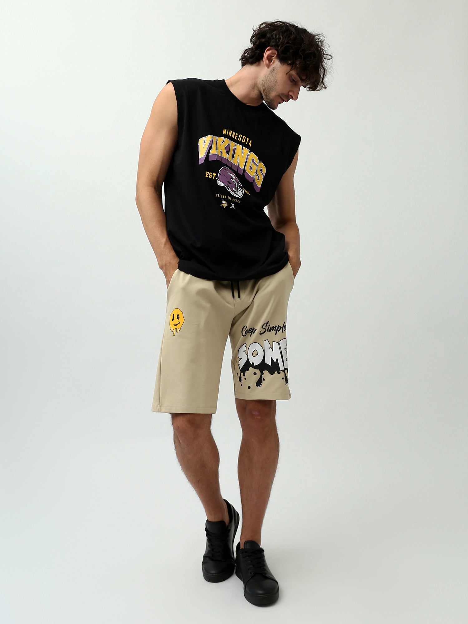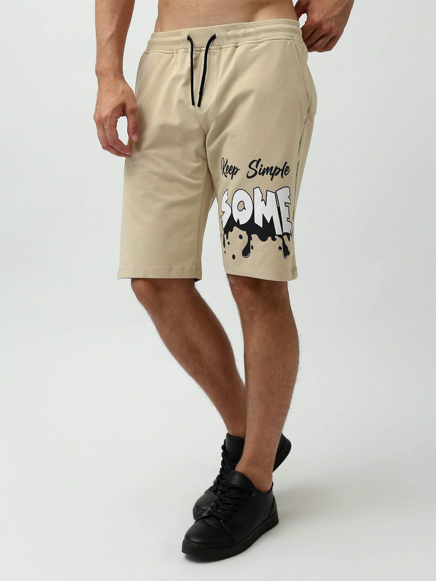 "Ces shorts homme comfort fit sont parfaits pour un look décontracté et confortable. Avec leur taille élastiquée et cordon de serrage, ils offrent un ajustement personnalisé, tandis que leur coupe ample garantit une grande liberté de mouvement. L’imprimé ‘Keep Simple SOME’ sur le côté ajoute une touche de style, faisant de ces shorts un choix idéal pour les journées décontractées. Faciles à assortir avec un t-shirt ou un hoodie, ces shorts sont disponibles en beige."