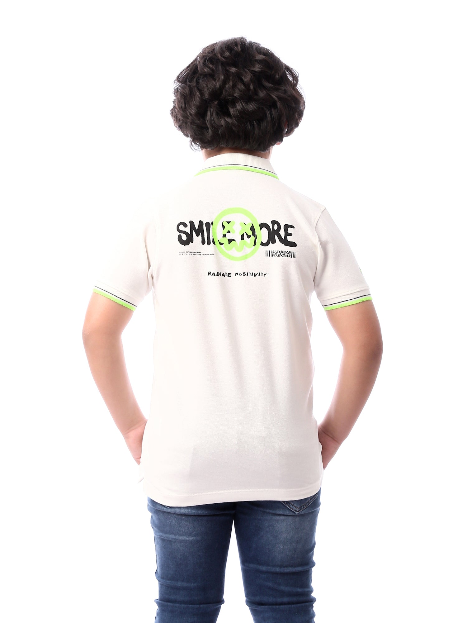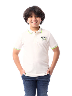T-shirt polo pour garçon en blanc avec une impression distinctive sur le devant et un design moderne incluant des détails verts autour du col et des manches. Idéal pour un usage quotidien, il apporte une touche d'élégance à toute tenue. Fabriqué en coton doux, il assure un confort optimal pour l'enfant tout au long de la journée. Un excellent choix pour les journées d'été ou même pour les activités sportives, alliant confort et style.