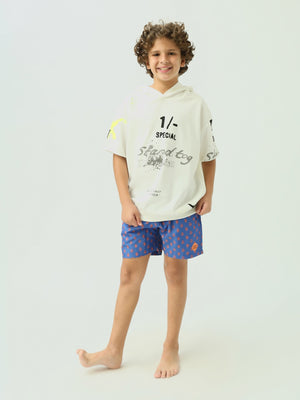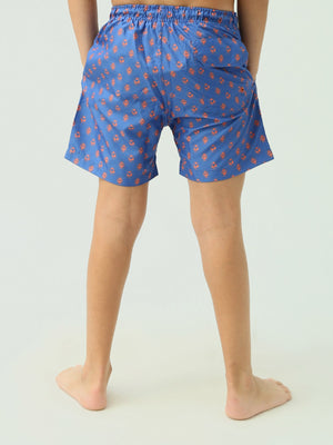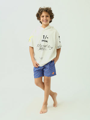 Short de bain pour enfants de couleur bleue avec un design décoré, idéal pour les activités aquatiques et les plages. Il est équipé d'une taille élastique pour un confort optimal pendant la baignade. Fabriqué dans un tissu léger, il permet une grande liberté de mouvement et assure un confort tout au long de la journée.
