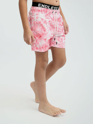 Ce short de bain pour enfant offre un design tie-dye moderne avec des nuances de rose, parfait pour les journées estivales et les activités aquatiques. Il est conçu pour offrir un maximum de confort avec une taille élastiquée et un cordon de serrage ajustable. Son tissu léger et résistant le rend idéal pour les plages, les piscines ou même les jeux en plein air. Le logo "ENDLESS" sur la taille ajoute une touche de style unique à ce short de bain.
