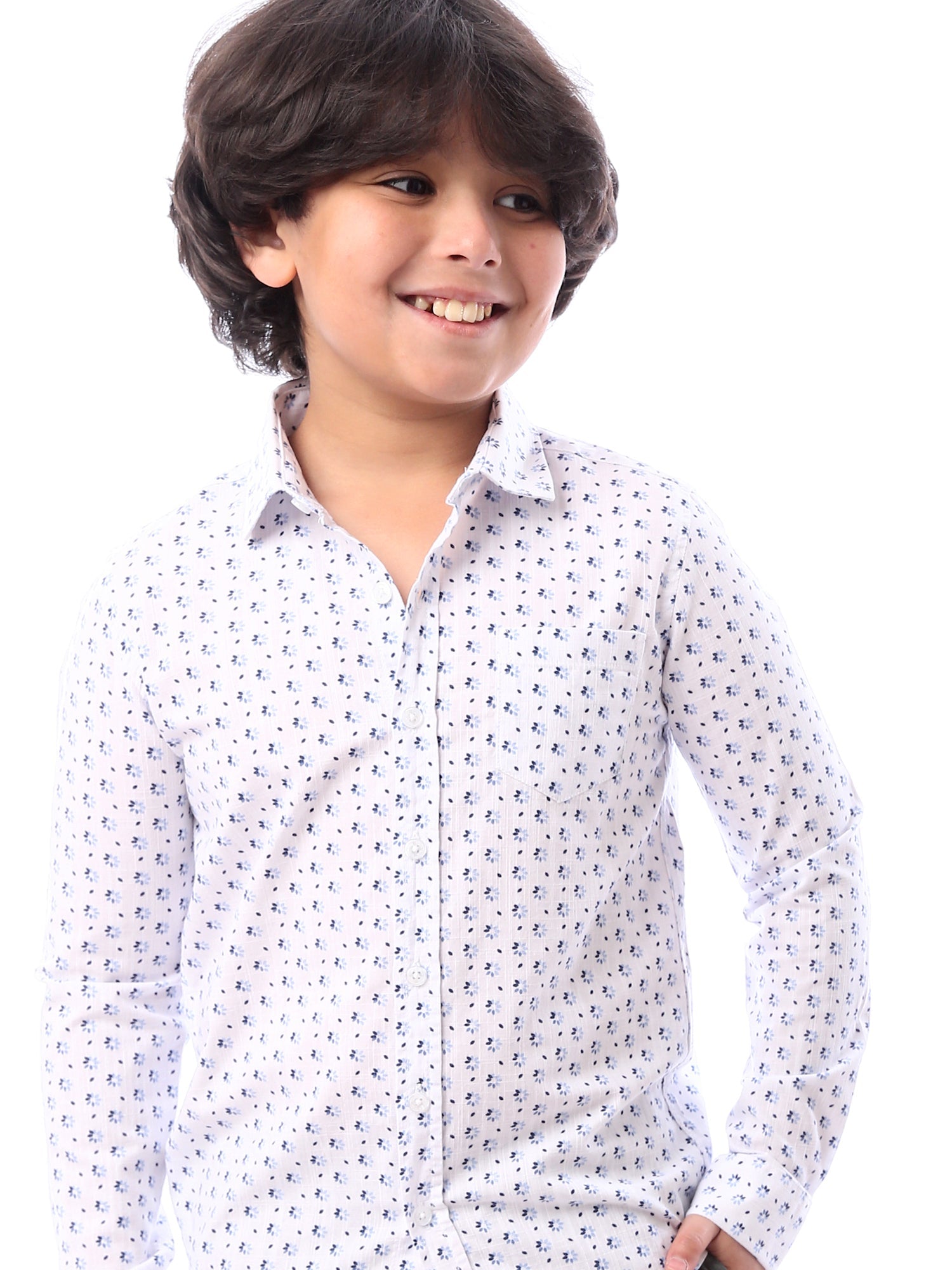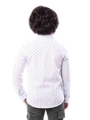 Chemise pour garçon décorée de motifs légers sur fond blanc. Elle se distingue par un design moderne avec des boutons avant et un col classique, ce qui la rend idéale pour les tenues quotidiennes ou les fêtes en famille. Fabriquée dans un tissu doux et confortable, elle assure un confort tout au long de la journée.