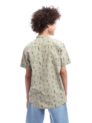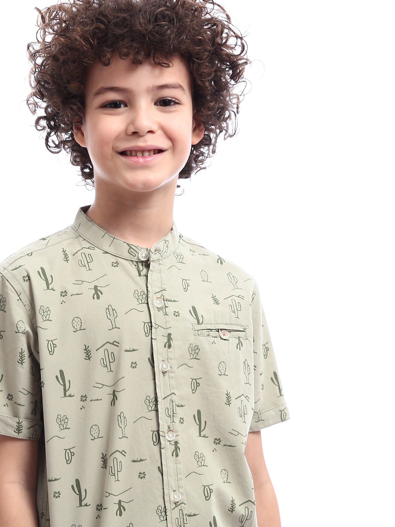 Chemise pour garçon de couleur olive avec une impression attrayante de cactus et de formes naturelles sur l'ensemble du t-shirt. Elle est dotée de boutons à l'avant et d'une poche pratique sur le devant, ce qui en fait un choix idéal pour les looks quotidiens ou les activités spontanées. Ce t-shirt moderne et confortable est fabriqué en tissu doux, garantissant un confort optimal pour l'enfant tout au long de la journée.