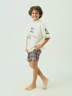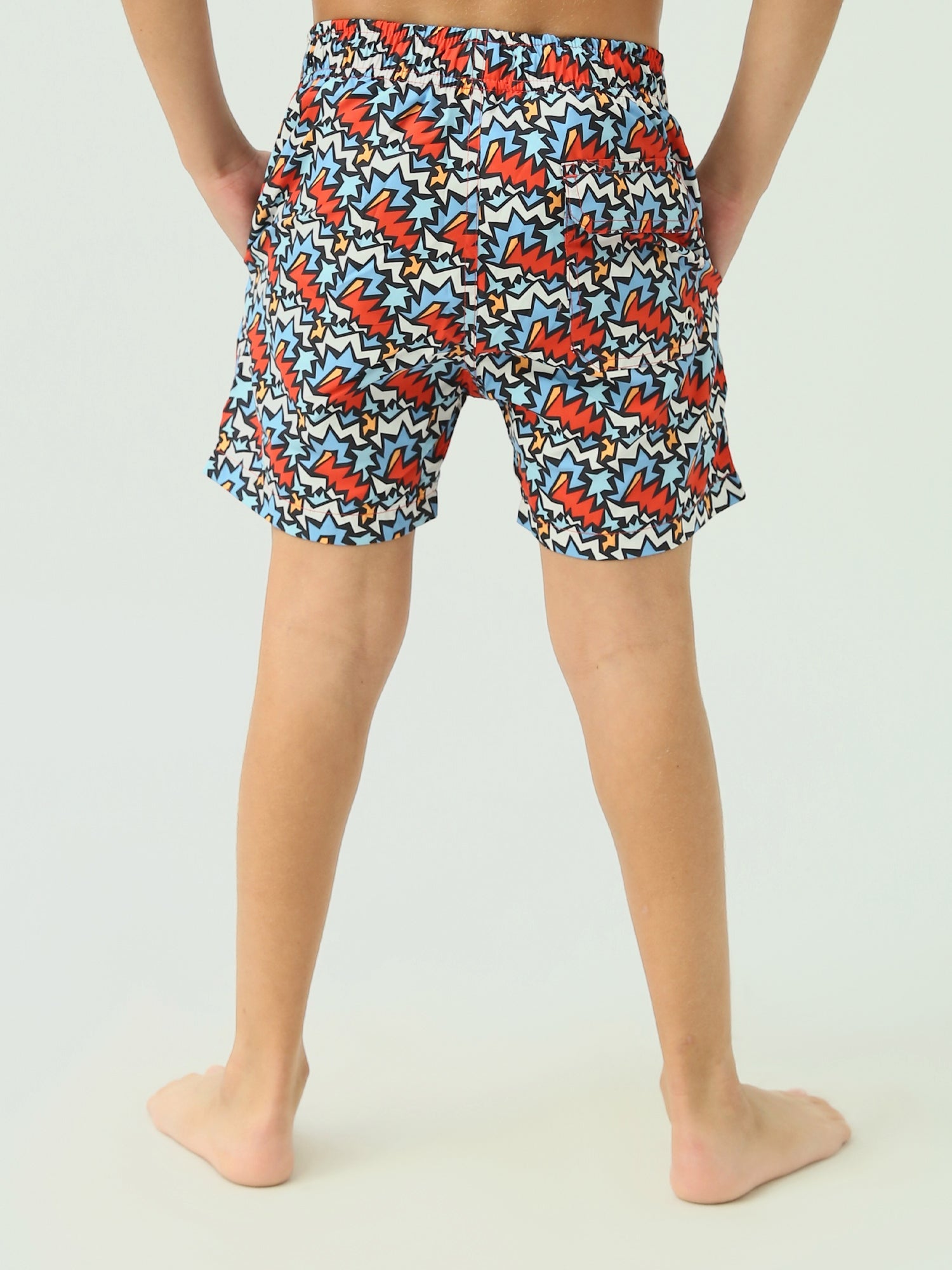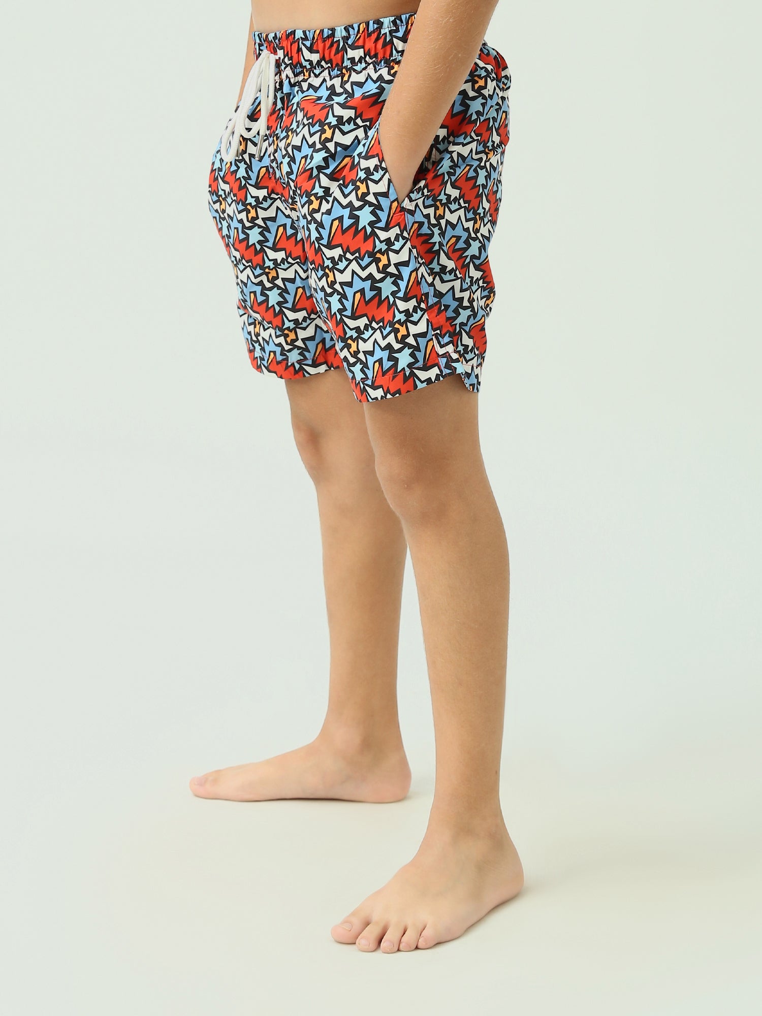 Short de bain pour enfants au design coloré et dynamique, avec des motifs géométriques multicolores qui rendent le look de votre enfant unique. Ce short est doté d'un cordon de taille ajustable pour un confort optimal et une grande liberté de mouvement. Fabriqué dans un tissu léger et à séchage rapide, il est idéal pour la piscine ou la plage pendant les journées chaudes. Il comprend des poches latérales pour ranger les petits objets pendant le jeu.