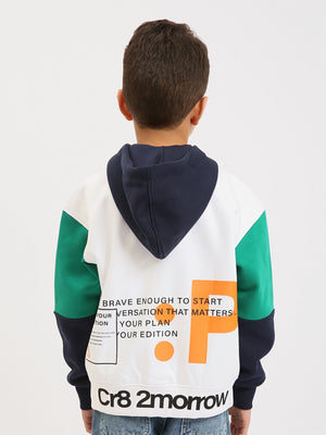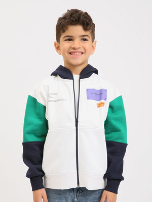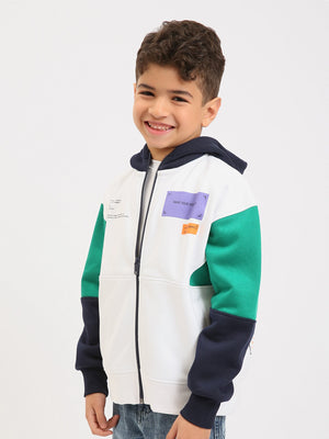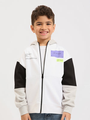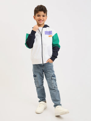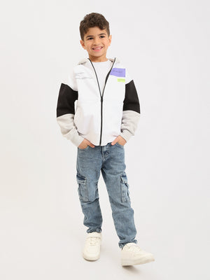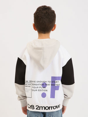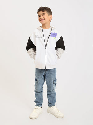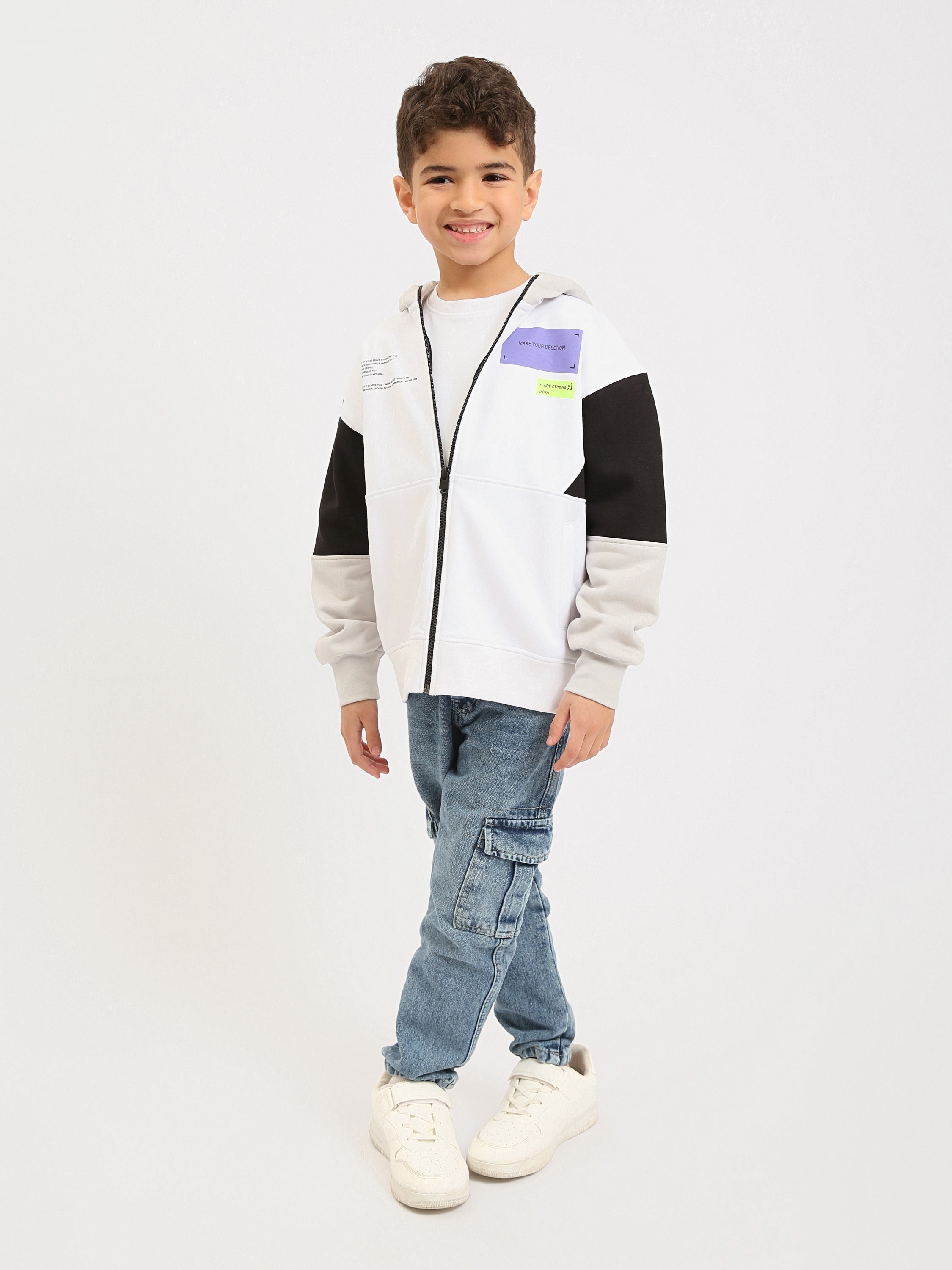 Sweat à capuche zippé garçon, bicolore blanc avec manches contrastées, poches et badges - SWS25WHNK76025MB1