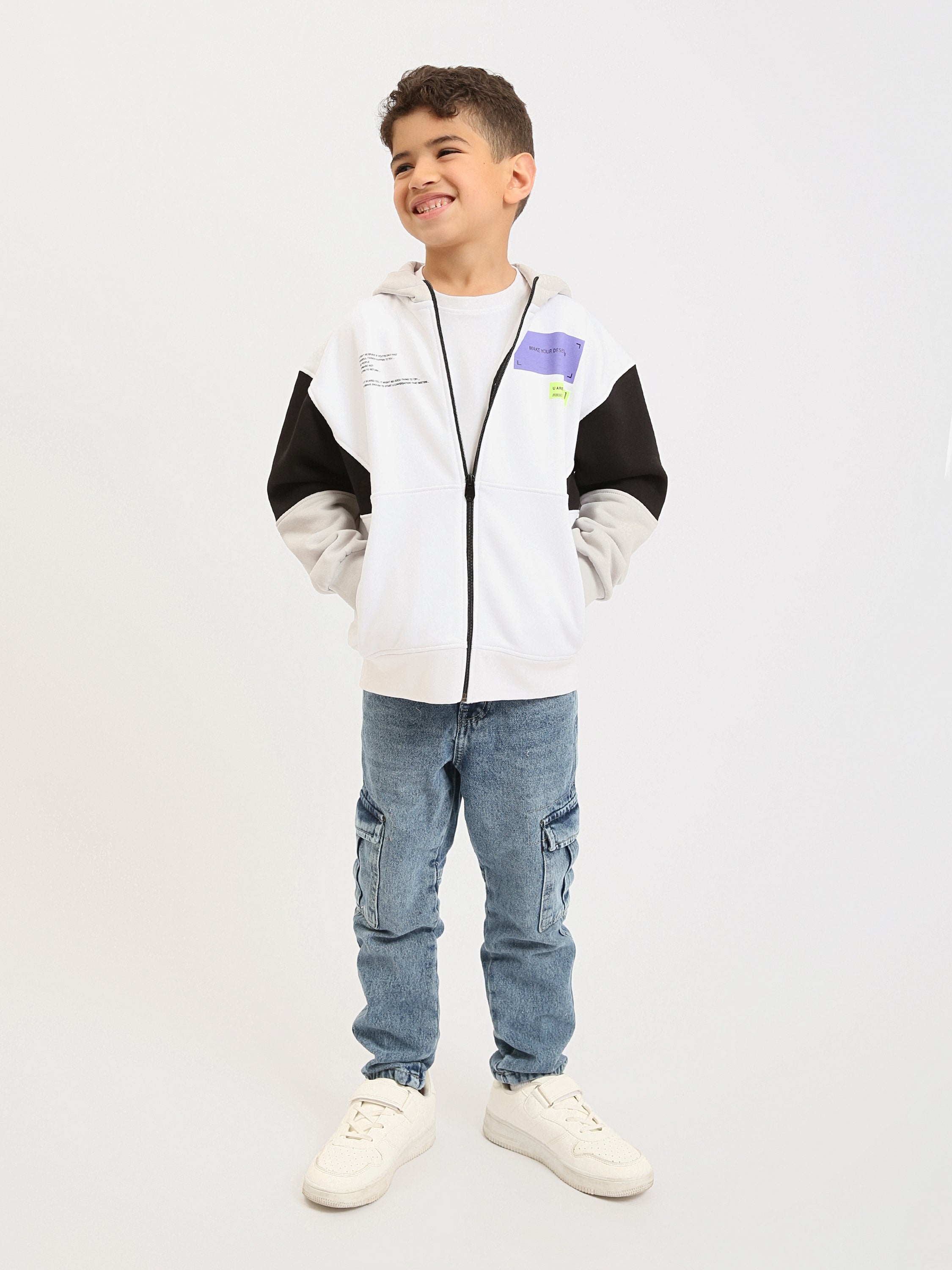 Ce sweat à capuche zippé pour garçon est parfait pour un look sport-chic au quotidien. Sa base blanche est rehaussée par des manches contrastées et une capuche assortie, pour un style moderne et facile à porter. Le modèle se distingue aussi par ses patchs/badges décoratifs sur la poitrine, qui ajoutent une touche tendance. Grâce à sa fermeture zippée intégrale, il s’enfile rapidement et se porte aussi bien ouvert que fermé. Les poches latérales apportent praticité, tandis que les bords-côtes aux poignets et à la base assurent un bon maintien.