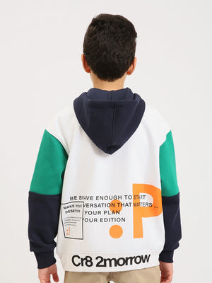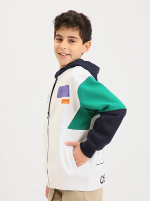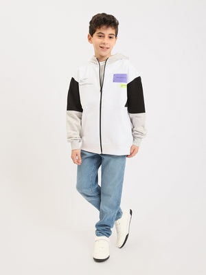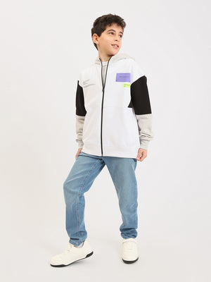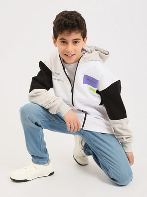Ce sweat à capuche zippé pour garçon ado est parfait pour un look sport-chic au quotidien. Sa base blanche est rehaussée par des manches contrastées et une capuche assortie, pour un style moderne et facile à porter. Le modèle se distingue aussi par ses patchs/badges décoratifs sur la poitrine, qui ajoutent une touche tendance. Grâce à sa fermeture zippée intégrale, il s’enfile rapidement et se porte aussi bien ouvert que fermé. Les poches latérales apportent praticité, tandis que les bords-côtes aux poignets et à la base assurent un bon maintien.
