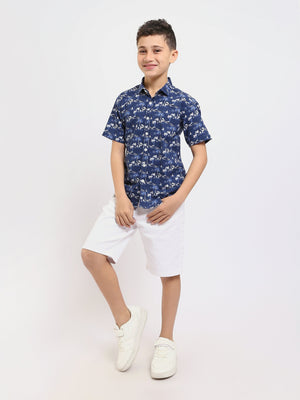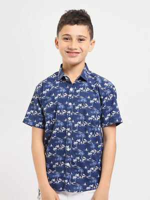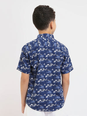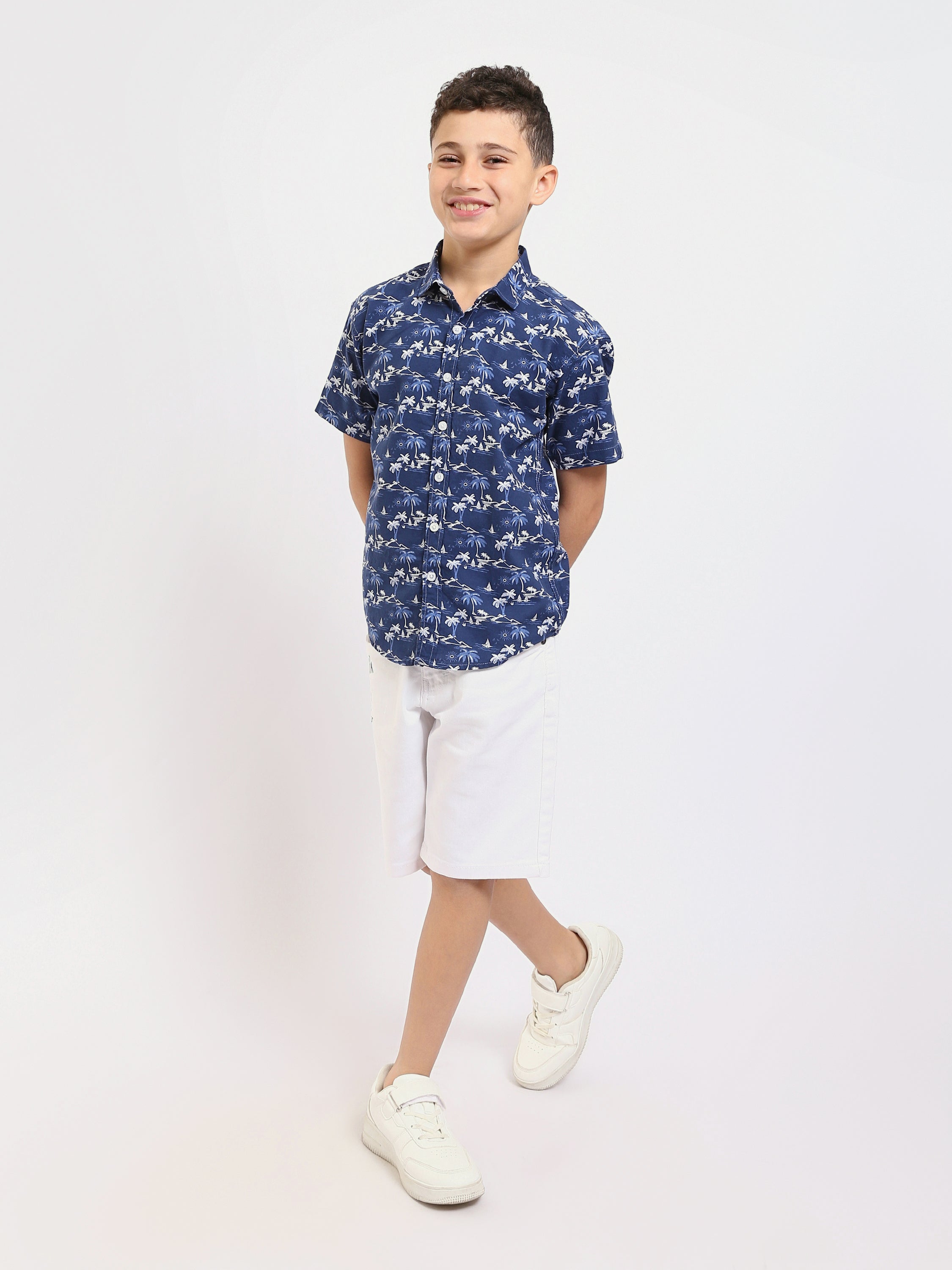 Chemise enfant garçon au design estival distinctif, mettant en valeur un motif tropical élégant inspiré de l’ambiance balnéaire. Son coloris bleu marine apporte une allure moderne et soignée. Dotée de manches courtes et de boutons frontaux pour un enfilage facile, elle offre une coupe confortable adaptée aux mouvements quotidiens des enfants.