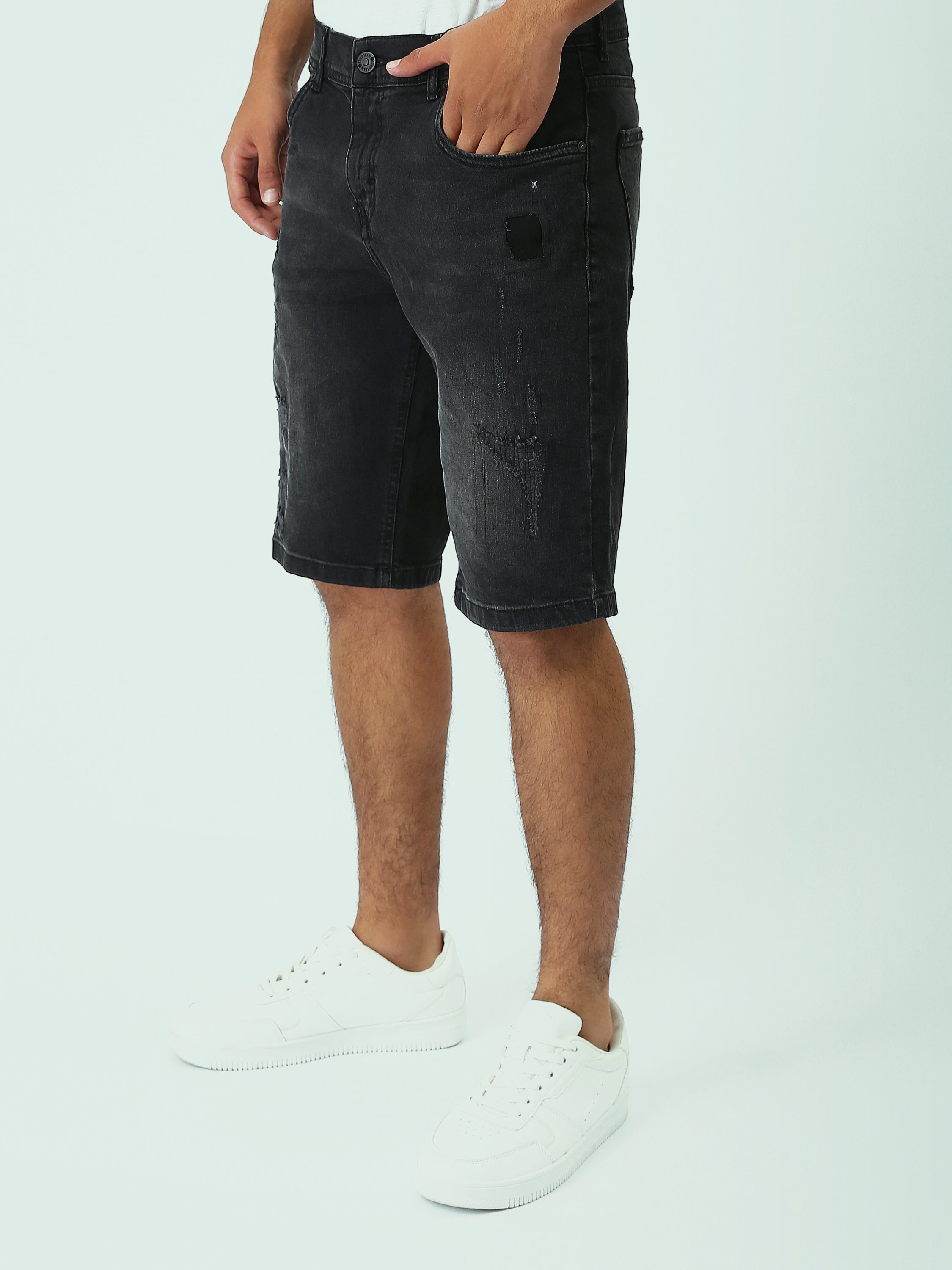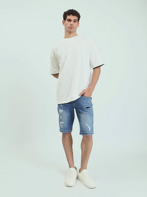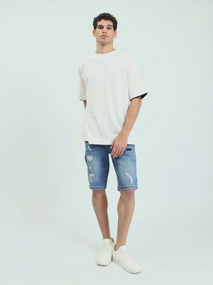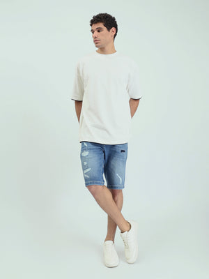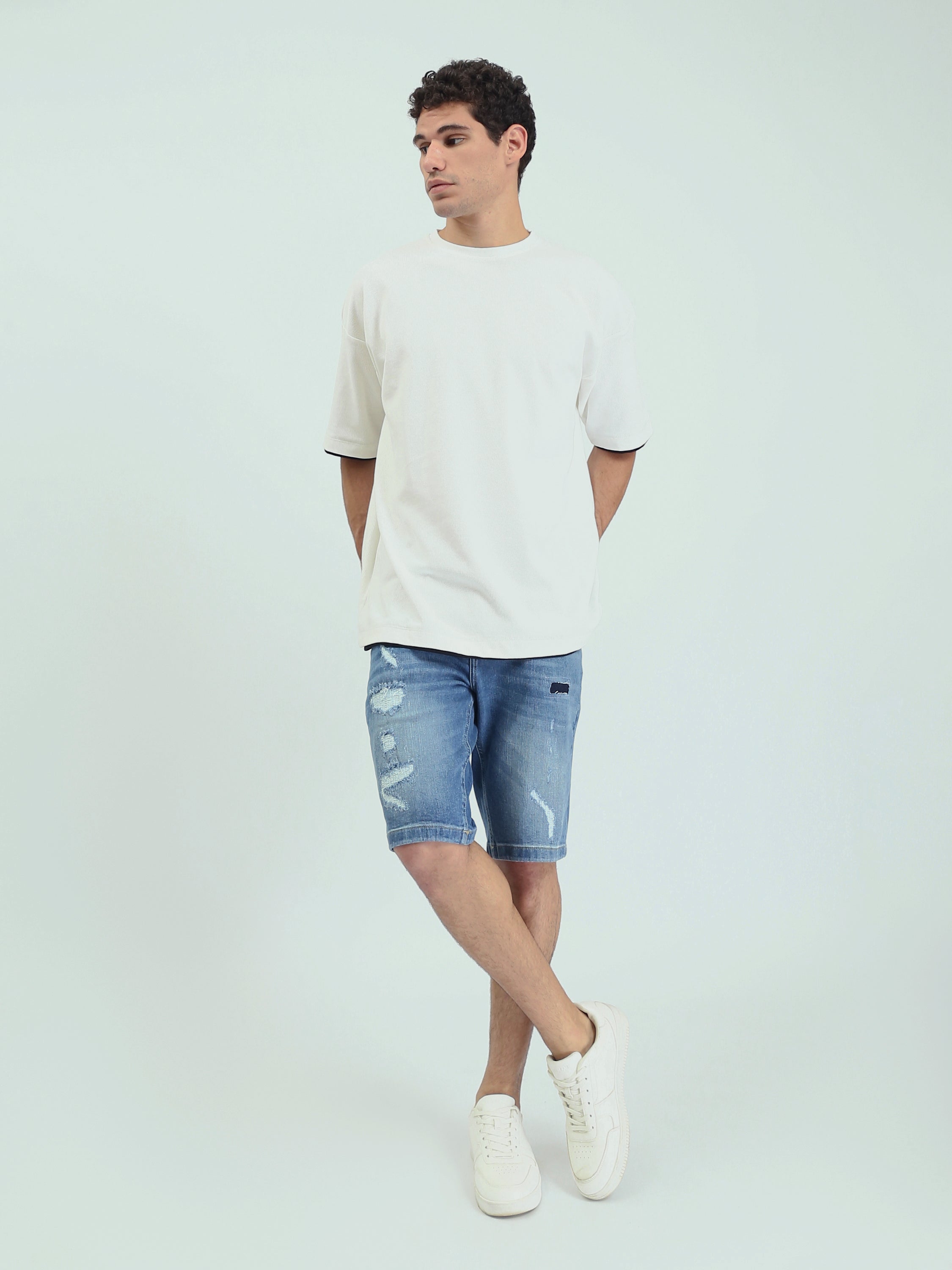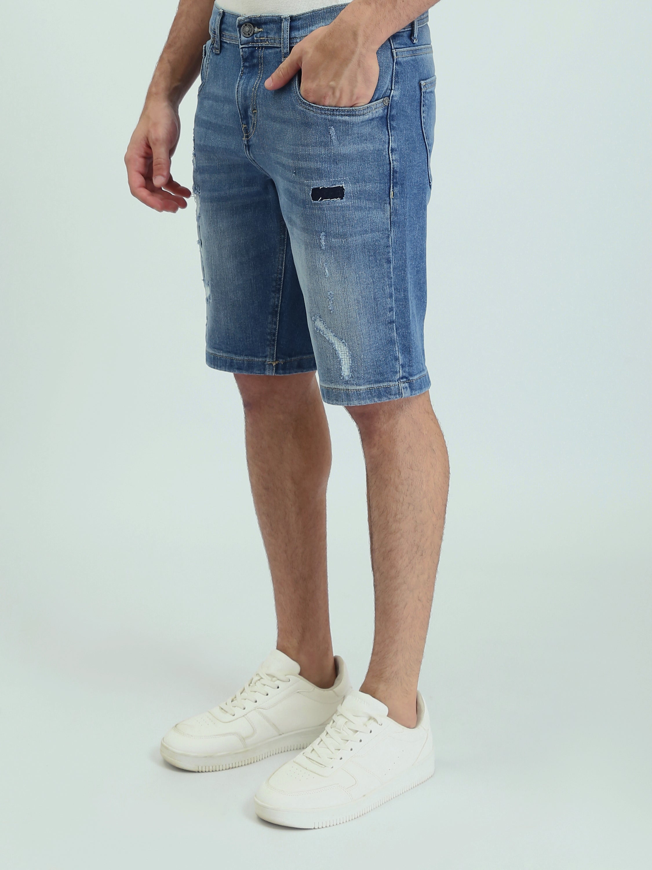 Short en jean pour homme de couleur bleu clair, au design moderne avec des détails de déchirures sur les poches et les jambes pour une touche de style contemporain. Fabriqué dans un tissu en jean léger et confortable, ce short est parfait pour les journées d'été et les activités quotidiennes. Il est équipé d'une taille élastique avec des boutons pour un confort optimal, ce qui en fait un excellent choix pour les occasions décontractées ou pour un look quotidien.