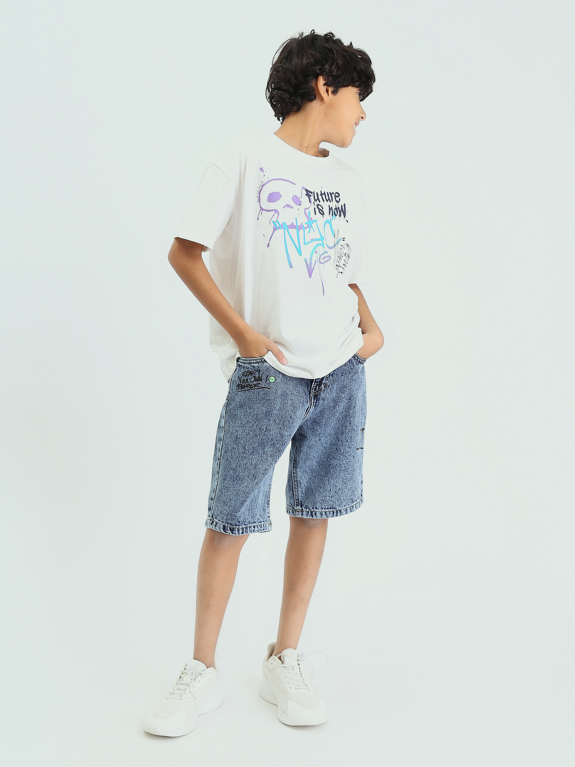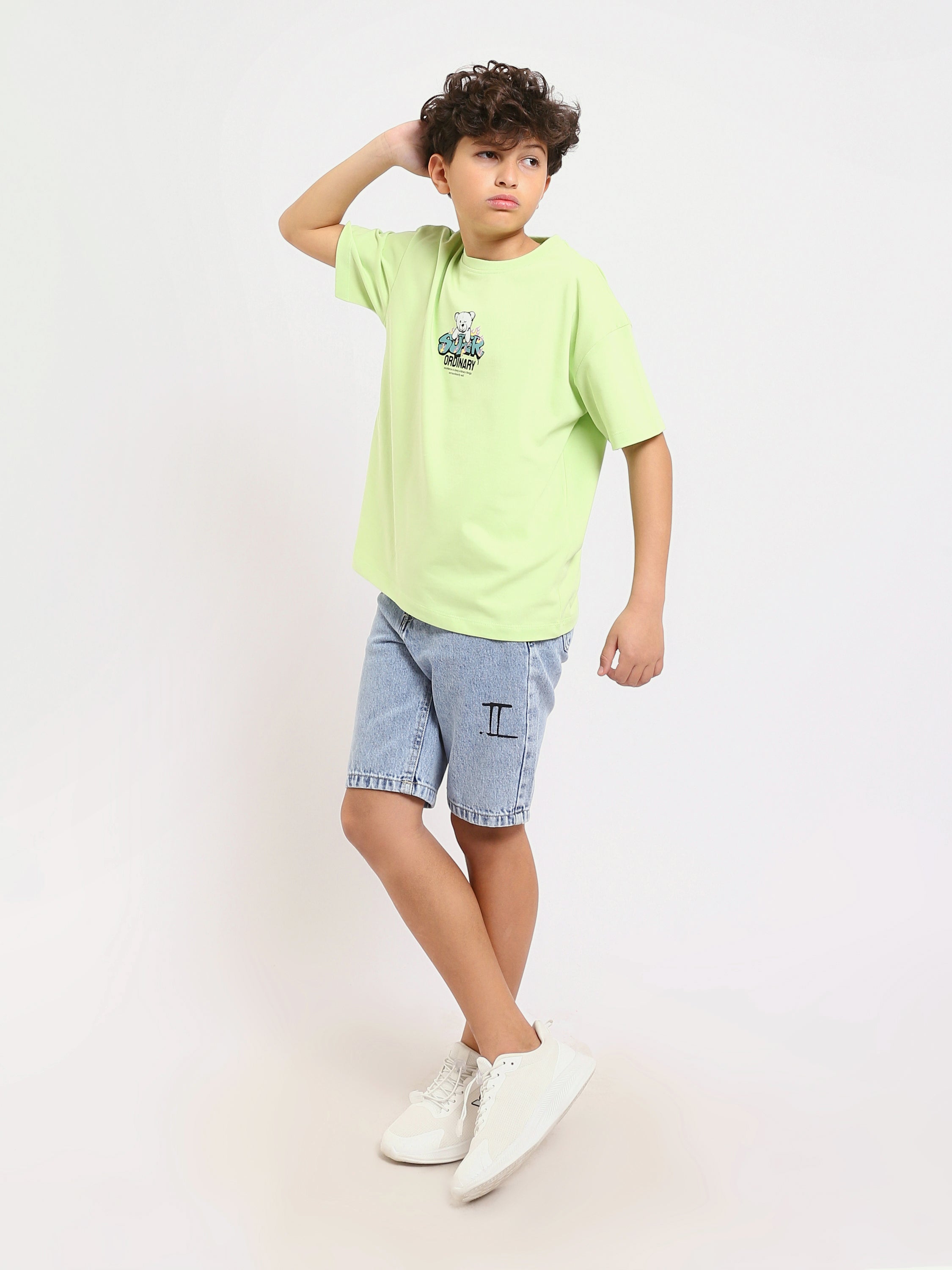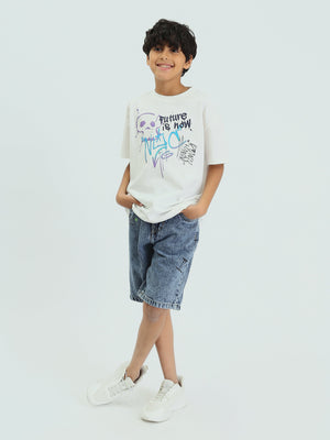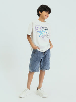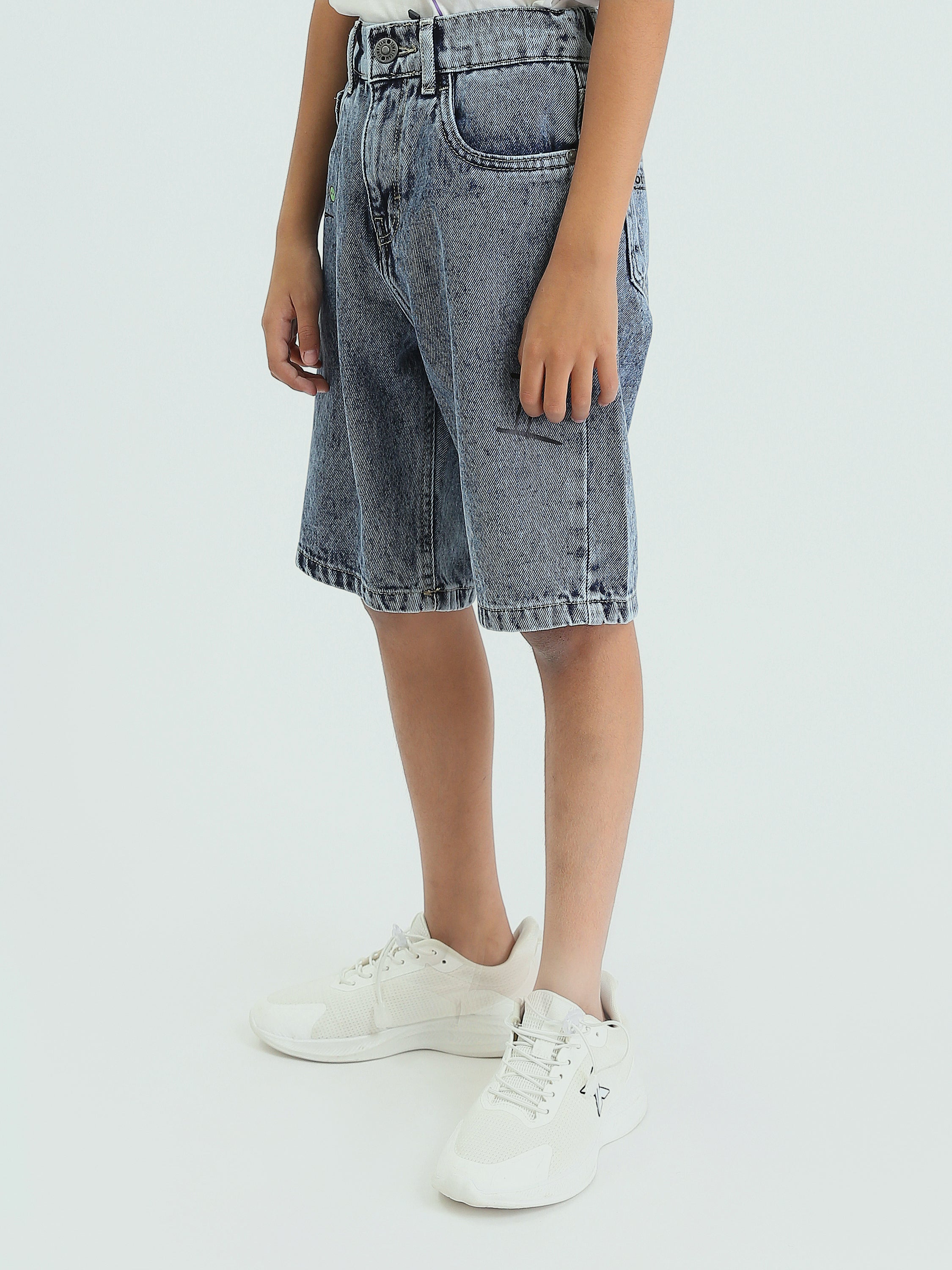 Short en jean pour enfants de couleur bleu clair, au design moderne avec une impression textuelle sur le devant pour ajouter une touche d'originalité.