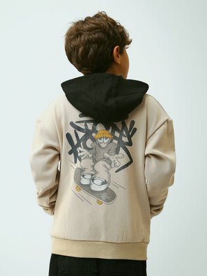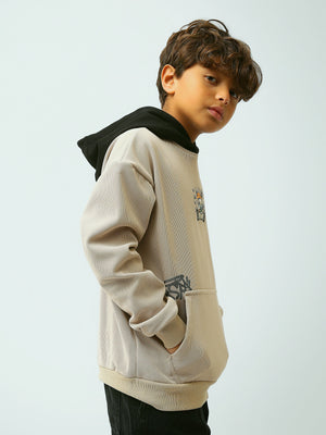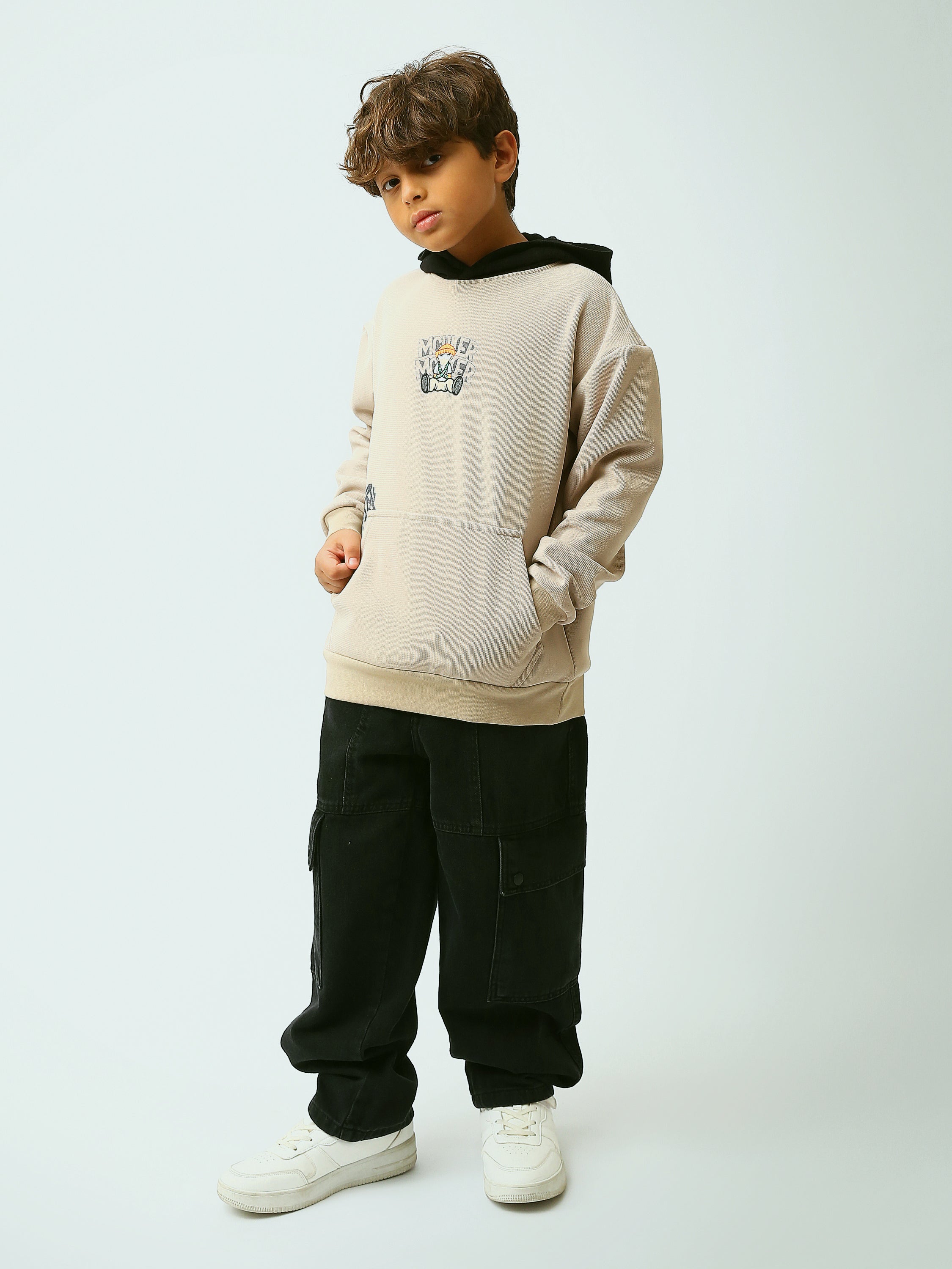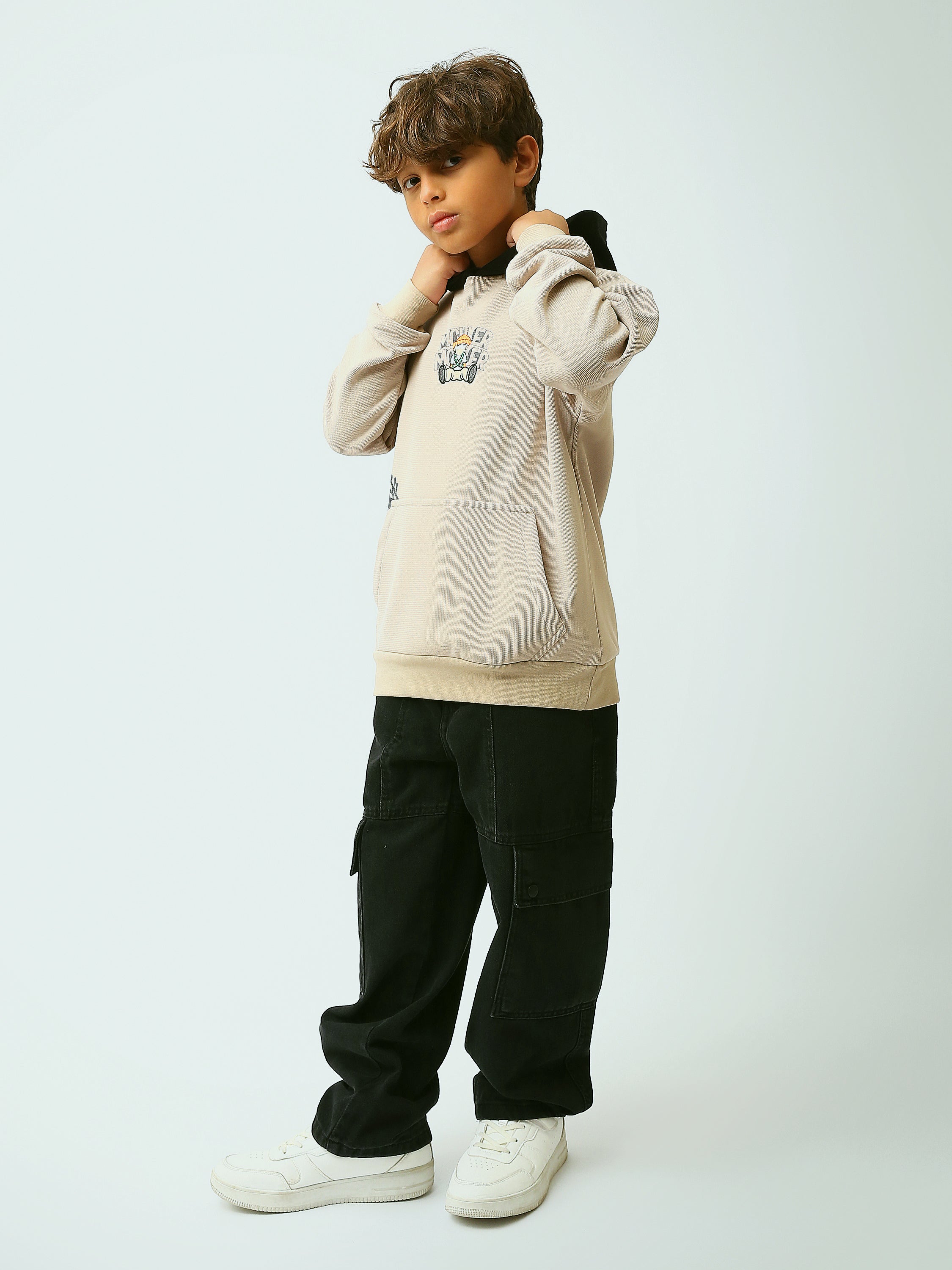 Adoptez un style casual et moderne avec ce sweat à capuche pour garçon, parfait pour la saison fraîche. Son design bicolore associe un beige pierre élégant à une capuche noire contrastante pour un look urbain facile à porter. Sur la poitrine, un petit imprimé cartoon ajoute une touche fun et originale, idéale pour le quotidien. La poche kangourou apporte praticité et confort, tandis que les finissions côtelées à la base assurent une bonne tenue et un tombé parfait.