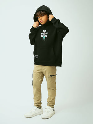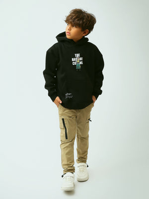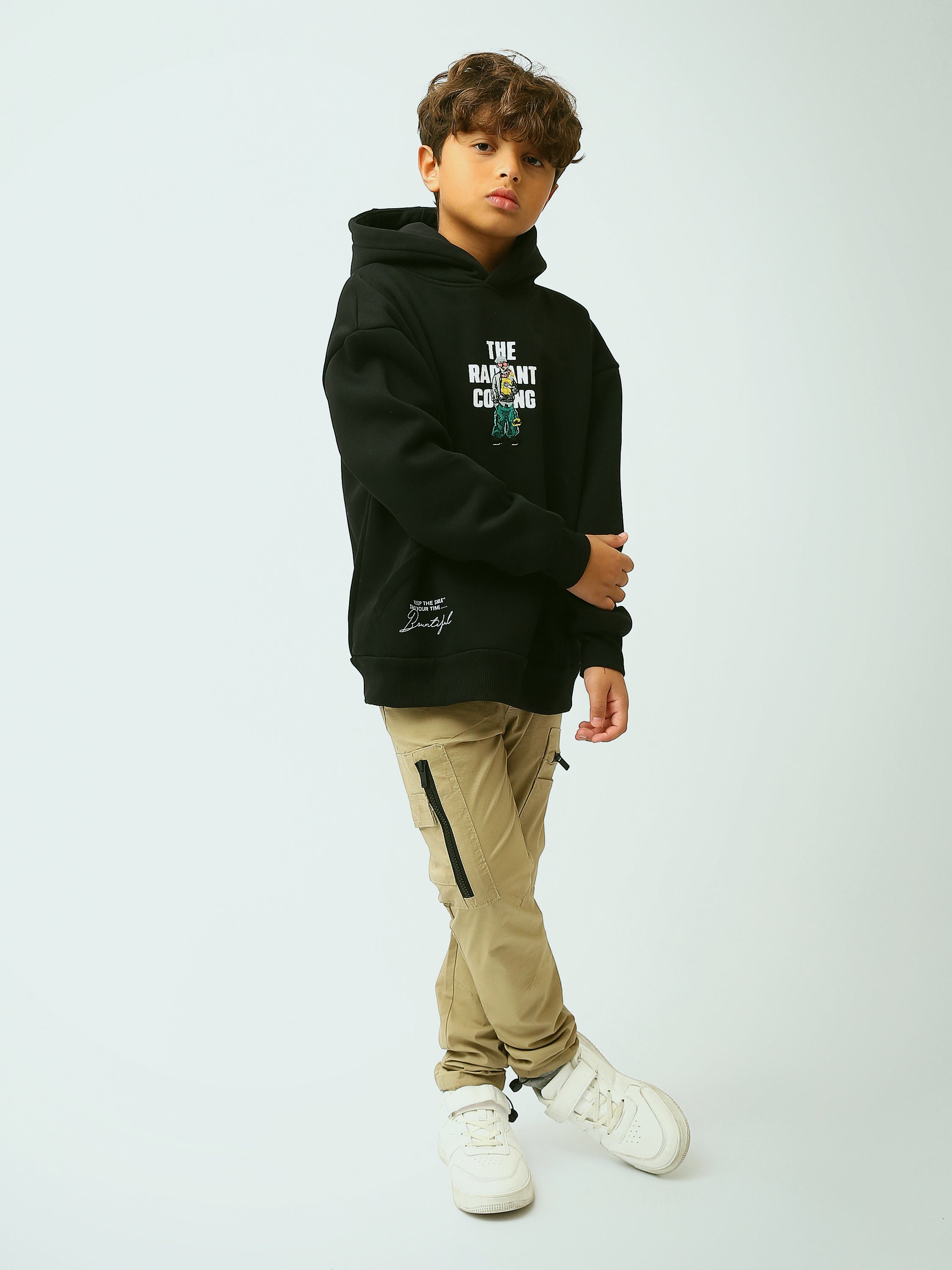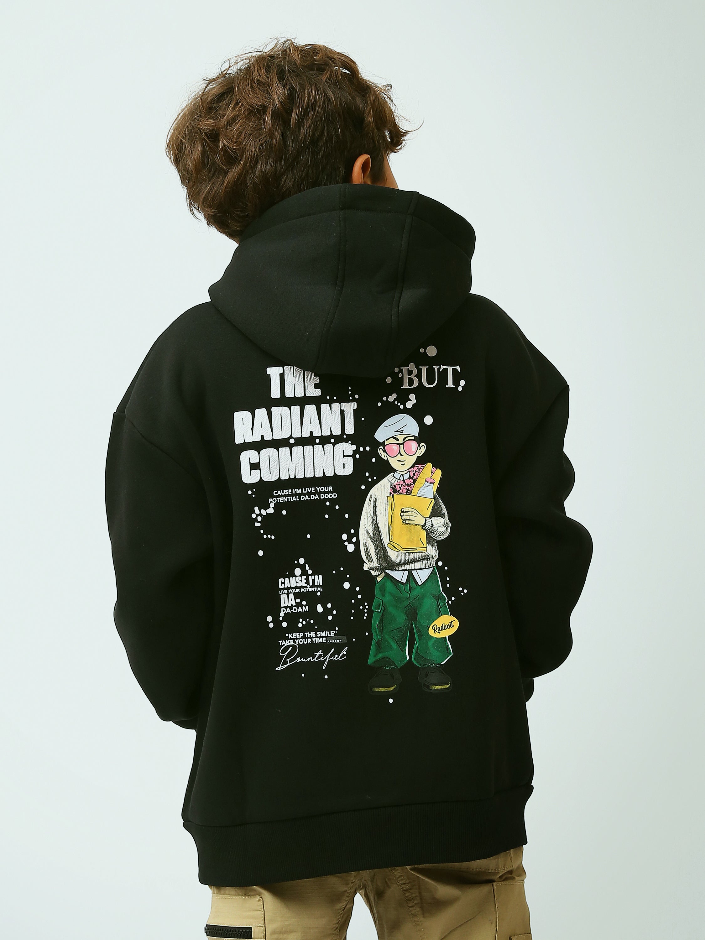 Adoptez un look urbain moderne avec ce sweat à capuche noir pour garçon, parfait pour l’école et les sorties. Son design se distingue par un imprimé central avec personnage et le texte “The Radiant Coming”, pour une touche tendance et originale. Confortable au quotidien, il est doté d’une capuche pour plus de protection et d’une poche kangourou pratique pour garder les mains au chaud ou transporter de petits essentiels. Les finitions soignées et la coupe confortable en font une pièce facile à porter et à associer avec un jean ou un pantalon cargo.