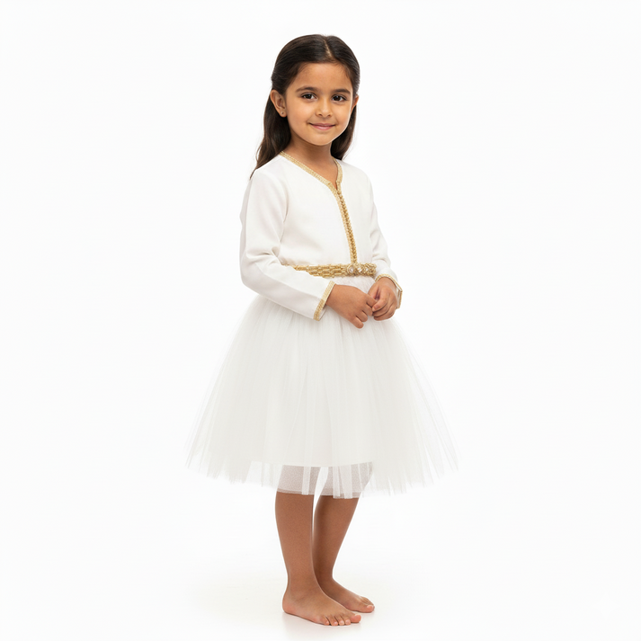 Cette tenue unique, idéale pour des occasions spéciales, marie harmonieusement simplicité et raffinement. Elle permet à la jeune porteuse de rayonner avec grâce, incarnant un parfait équilibre entre tradition et modernité.