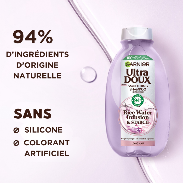 Application : Après chaque shampooing, appliquez sur cheveux humides et rincez. Complétez la routine par le masque Ultra Doux Infusion d'Eau de Riz