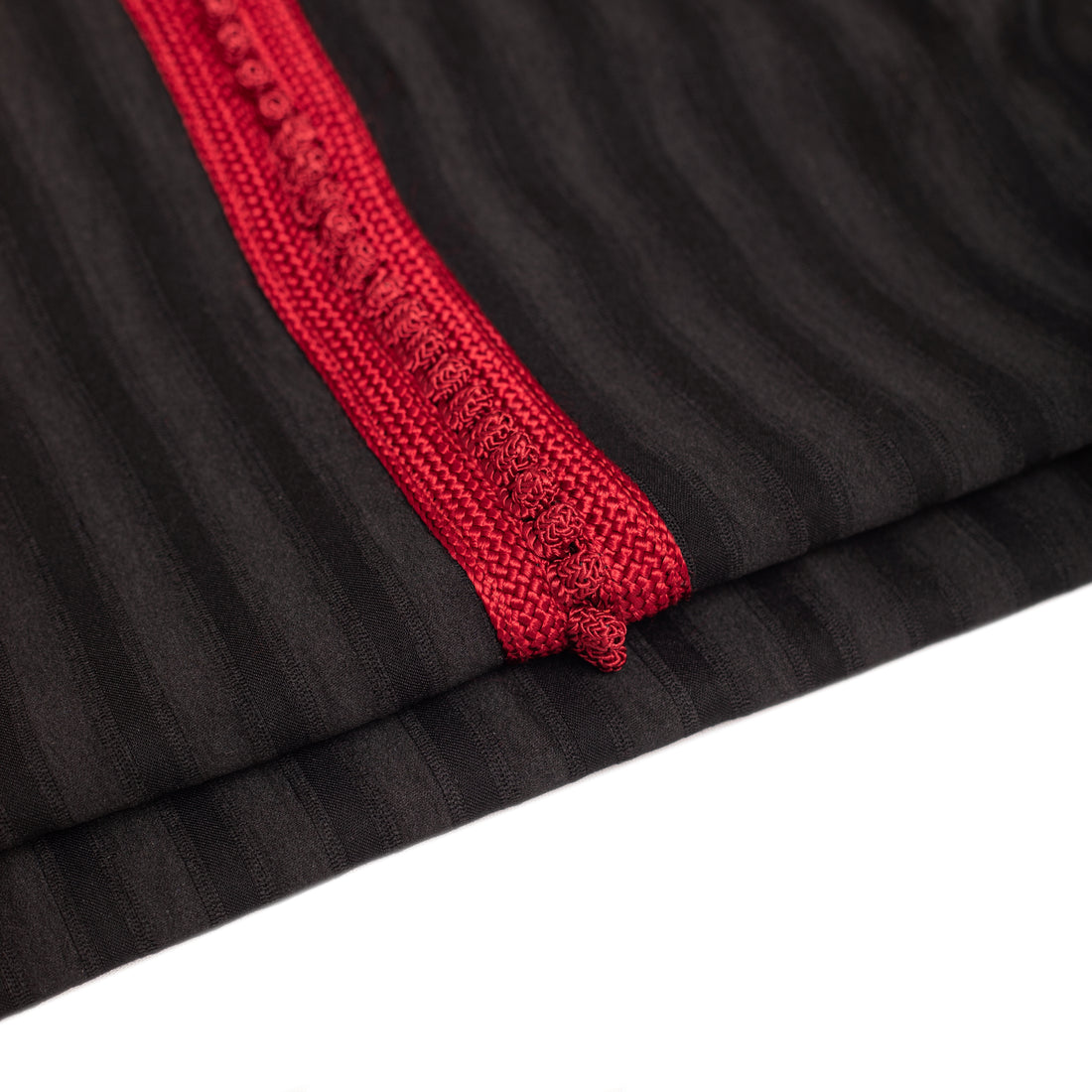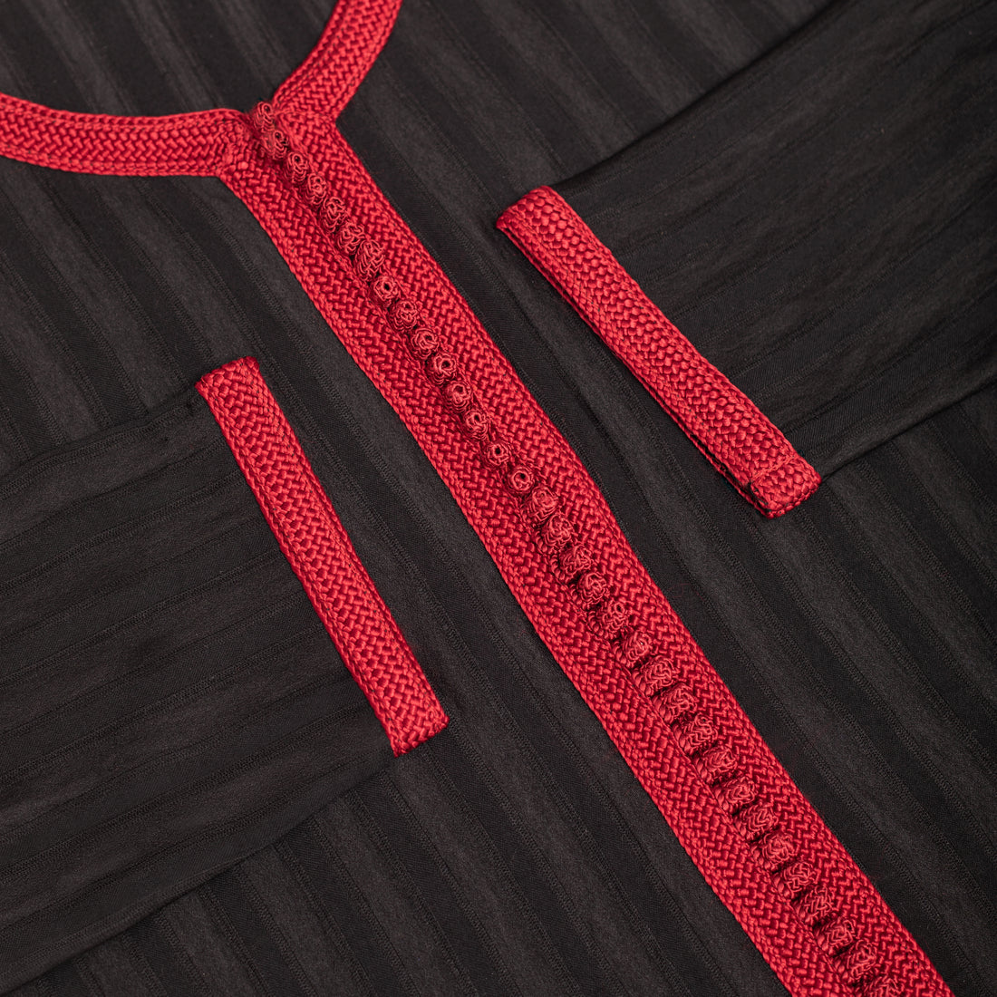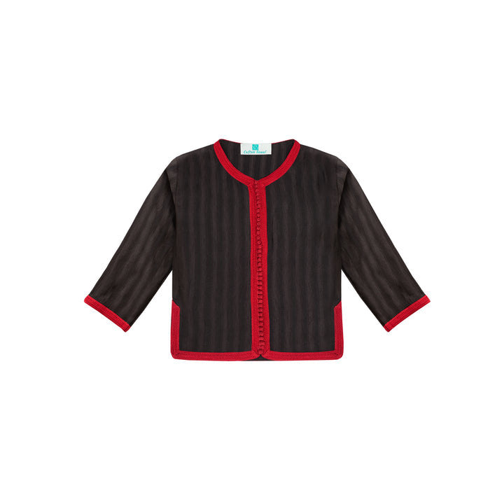 Découvrez l'élégance intemporelle de notre tunique pour enfant, sublimée par un magnifique tissu noir avec des rayures en gris qui apportent une allure sophistiquée et classique. Les bordures en Sfifa d'un rouge vif parcourent avec finesse l'encolure, les manches, la fermeture centrale et les contours, créant un contraste audacieux et captivant. Les boutons Aâkad, également ornés de rouge, apportent une touche artisanale unique à cette pièce.