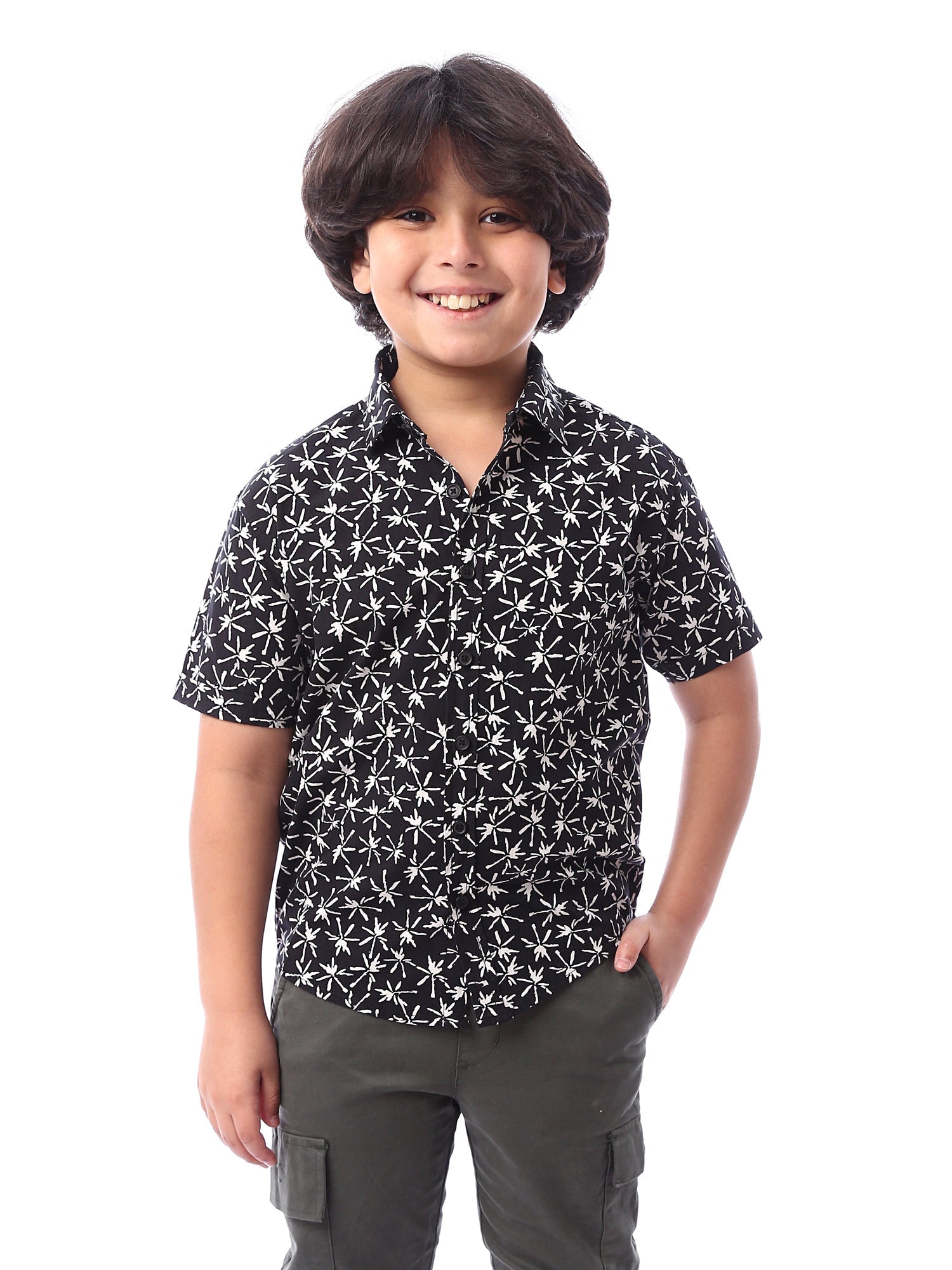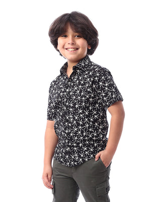 Chemise pour garçon décorée d'un design élégant en noir et blanc, avec des motifs floraux modernes. Fabriqué dans un tissu léger et confortable, il est parfait pour les occasions quotidiennes ou les sorties en famille. Dotée de manches courtes et d'un col classique avec des boutons à l'avant, cette chemise est un choix idéal pour la saison estivale.