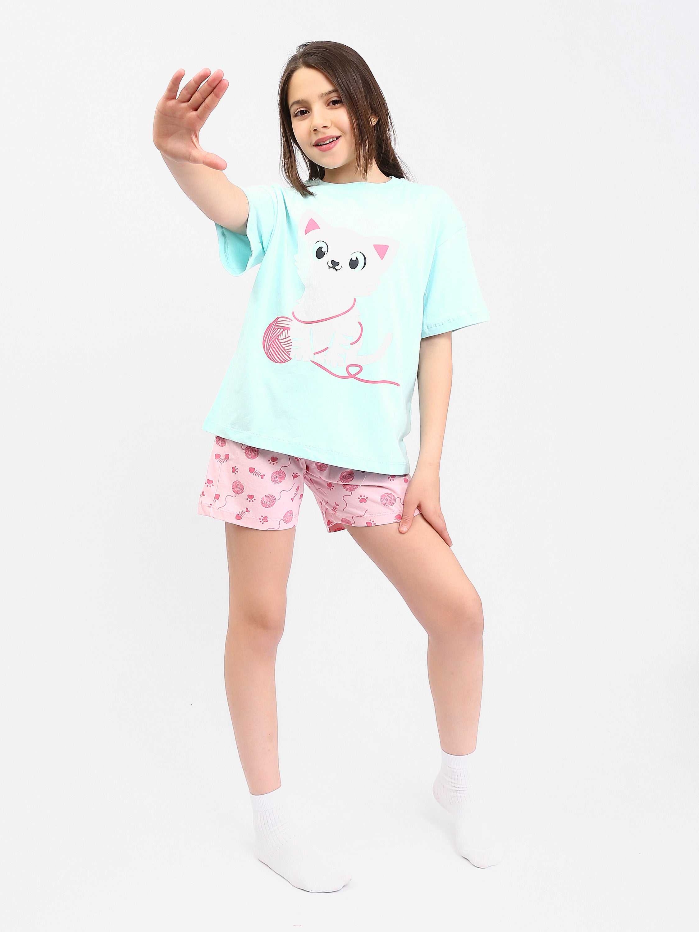 Ce pyjama adorable et confortable pour filles est l'option parfaite pour les nuits douillettes. Avec un design charmant, l'ensemble présente un t-shirt orné d'un chat mignon avec une pelote de laine, parfait pour les amoureuses des animaux. Le short à motifs de pelotes de laine et de petites empreintes de pattes ajoute une touche amusante et colorée.