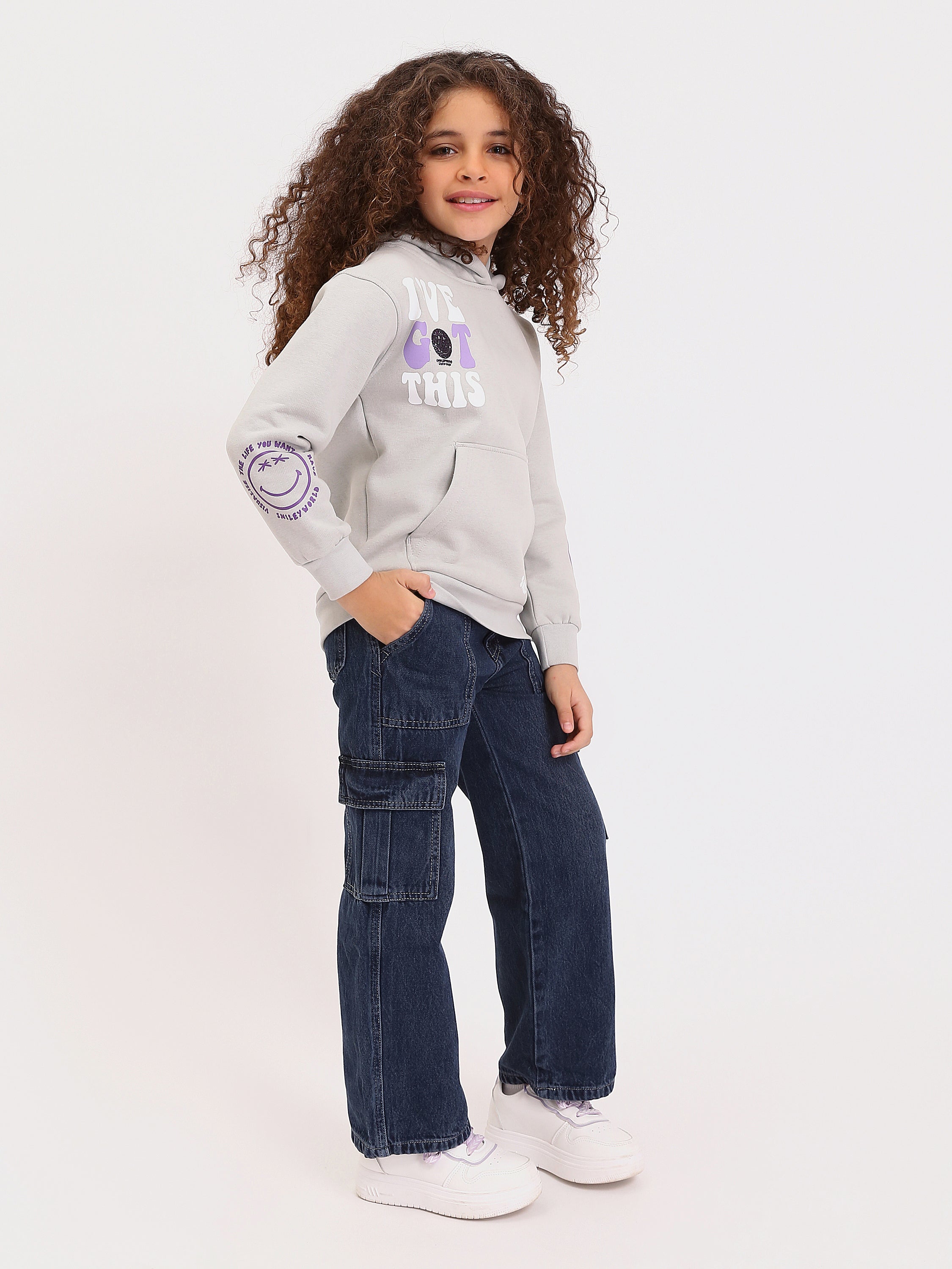 Donnez à votre enfant un look tendance et motivant avec ce sweat à capuche "I'VE GOT THIS", parfait pour les filles de 4 à 8 ans. Ce modèle gris clair présente une inscription audacieuse "I'VE GOT THIS" sur le devant, accompagnée de graphiques colorés sur les manches et le bas du vêtement. Le logo "SMILEY WORLD" apporte une touche joyeuse et positive.